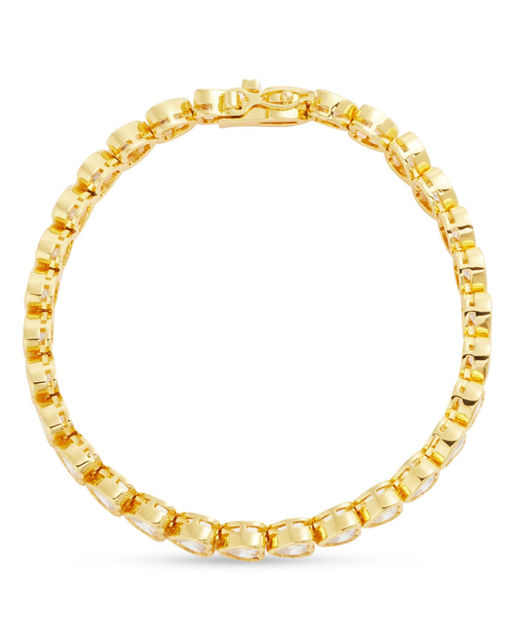 Made from gold-plated brass with cubic zirconia accents. The bracelet measures 7.25'L and features a secure box clasp closure with a safety mechanism.