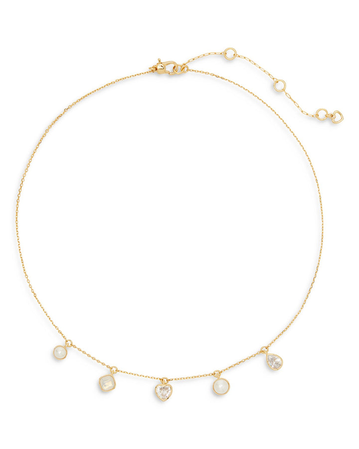 This Bubbly Bezel Imitation Pearl & Cubic Zirconia Charm Necklace by Kate Spade New York, from the Bubbly Bezel collection, is a radiant piece that blends timeless pearls with sparkling cubic zirconia and glass stones. Perfect for adding a touch of elegance to any outfit.