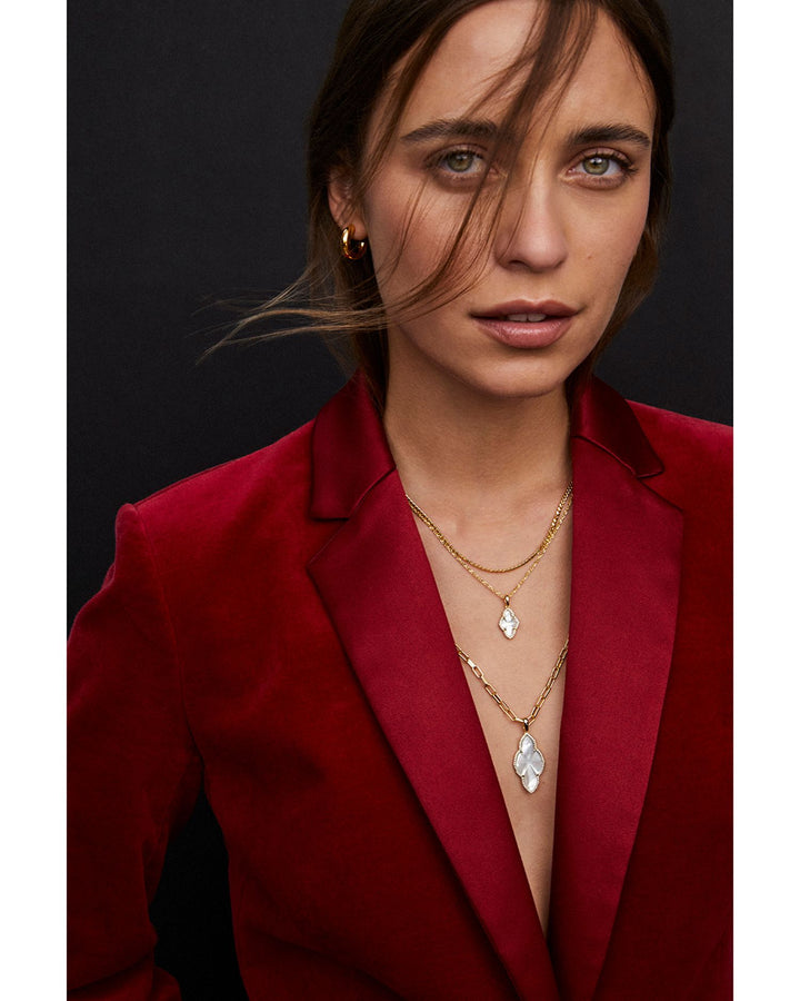Crafted in 14K gold-plated metal with glass and mother-of-pearl or green illusion stones. The necklace features a 1.5' frontal drop, adjustable 16' and 17' lengths with a 3' extension, and is secured with a toggle closure or lobster clasp for removable layers.