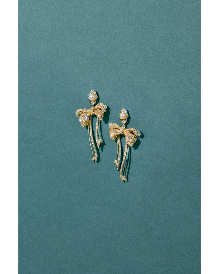 Krista Cubic Zirconia & Cultured Freshwater Pearl Bow Statement Earrings in Gold Tone