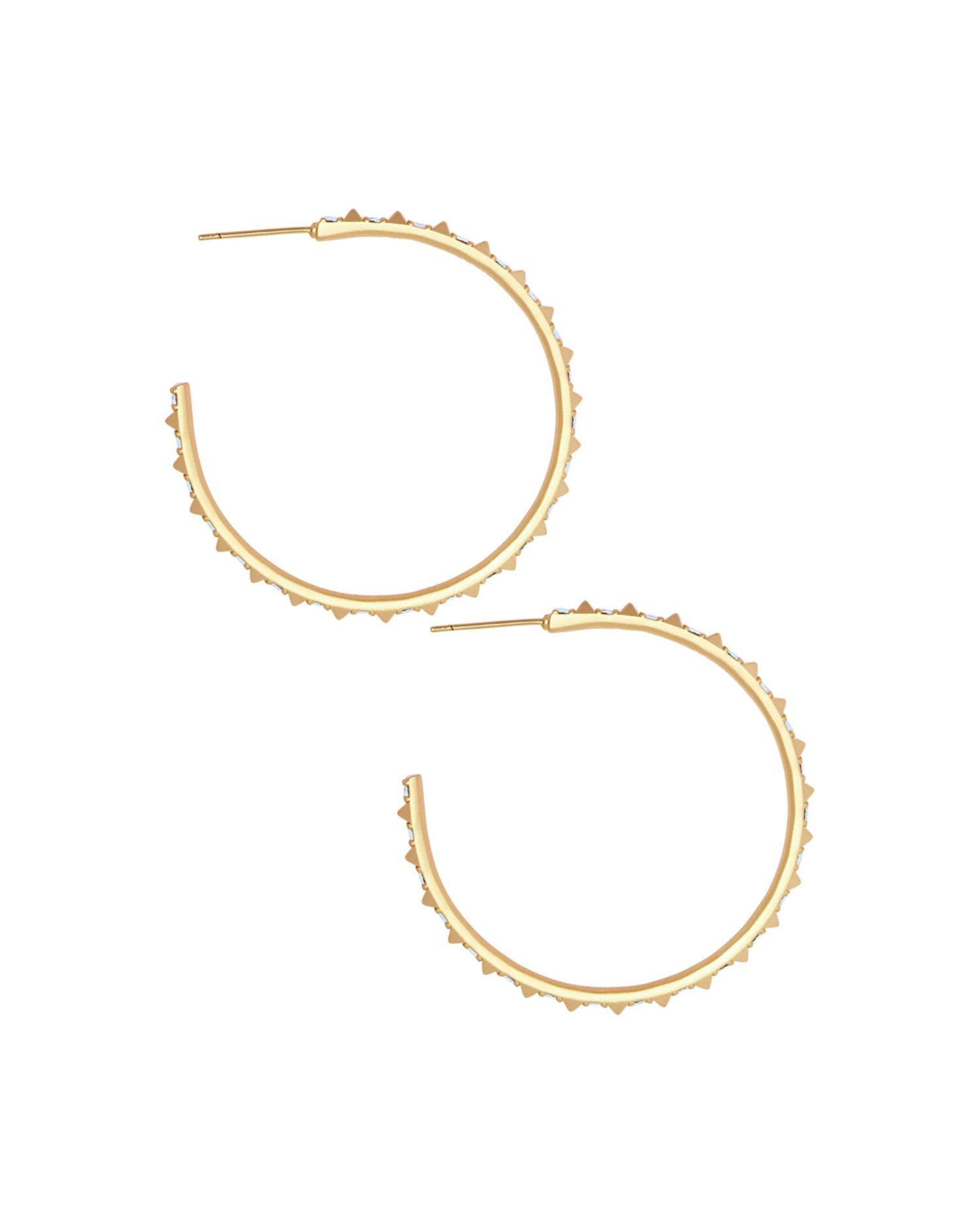 Available in 14K gold-plated, 14K rose gold-plated, or rhodium-plated metal with glass accents. The earrings measure 1.7' in diameter and are secured with a post-back closure.