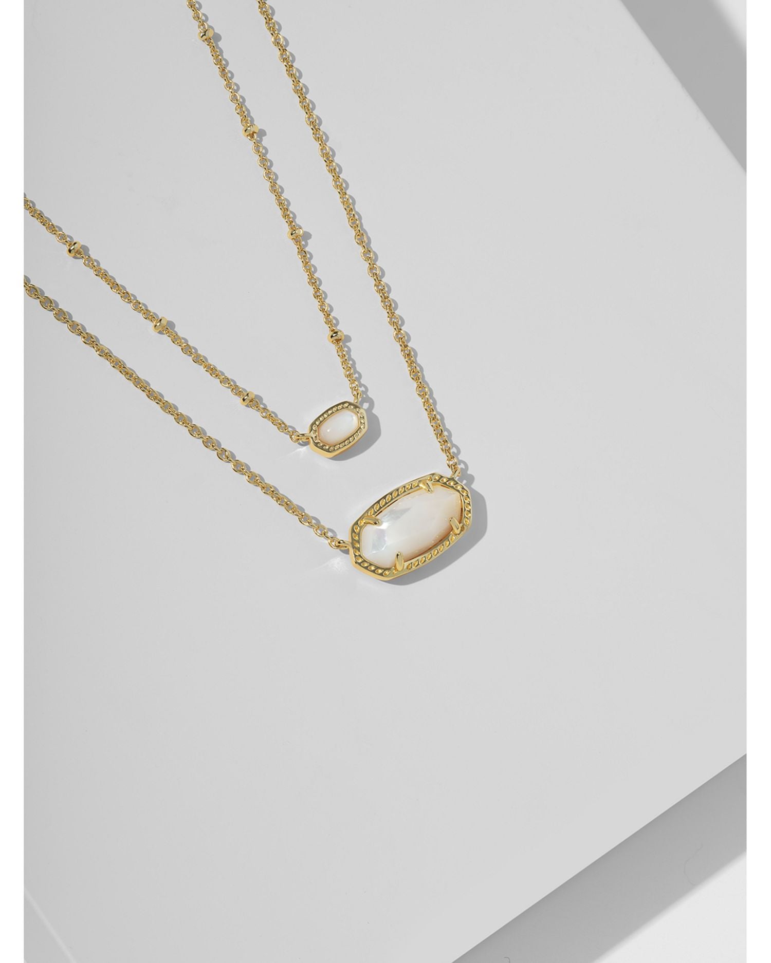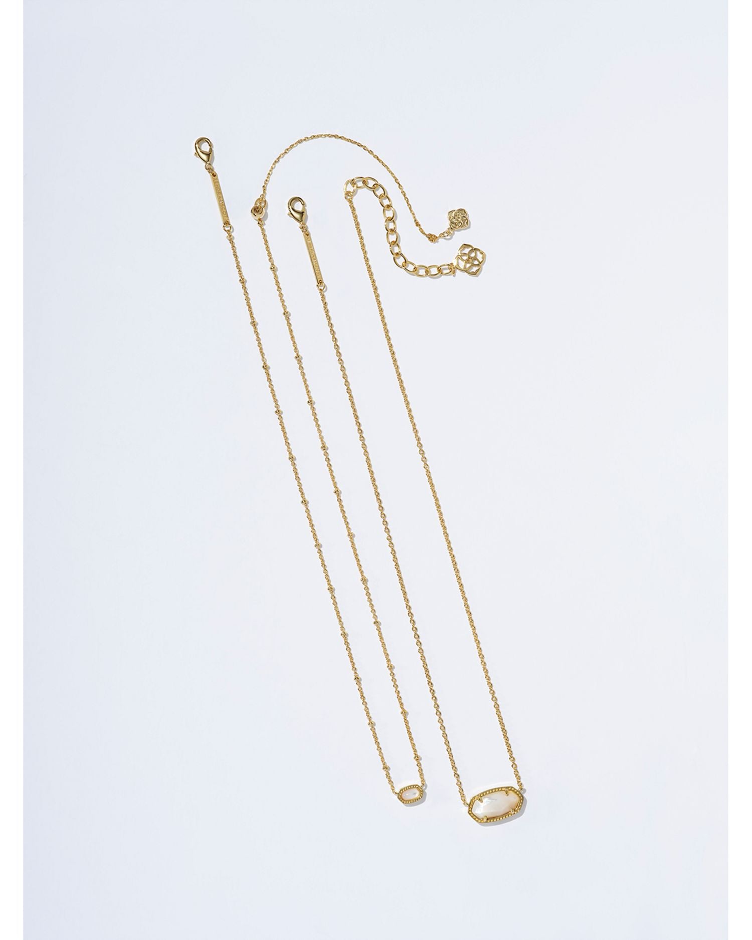 Crafted in 14K gold-plated brass with magnesite, nanogem, or Mother-of-Pearl accents. The chain measures 15'L with a 4' extender, and the pendant is 0.39'L x 0.21'W. Secured with a lobster clasp and single adjustable slider bead.