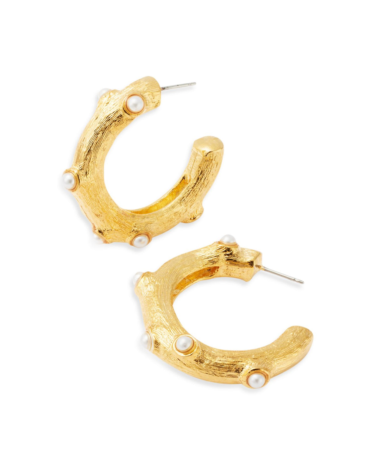 These Hoop Earrings by Kenneth Jay Lane are a timeless design with a choice of elegant imitation pearls or resin accents. The 22K gold-plated finish adds a luxurious touch, making them perfect for everyday or special occasions.