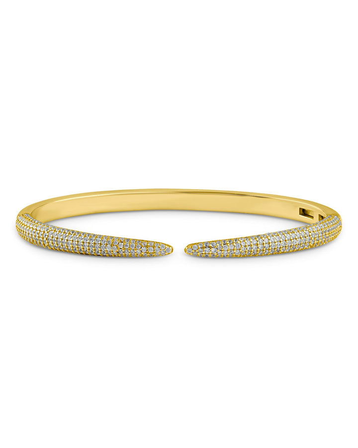 This Pavé Spike Bracelet by Kenneth Jay Lane combines edgy elegance with sparkling cubic zirconia accents on a sleek spiked design. Available in gold-plated or rhodium-plated finishes, it’s a standout addition to your jewelry collection.
