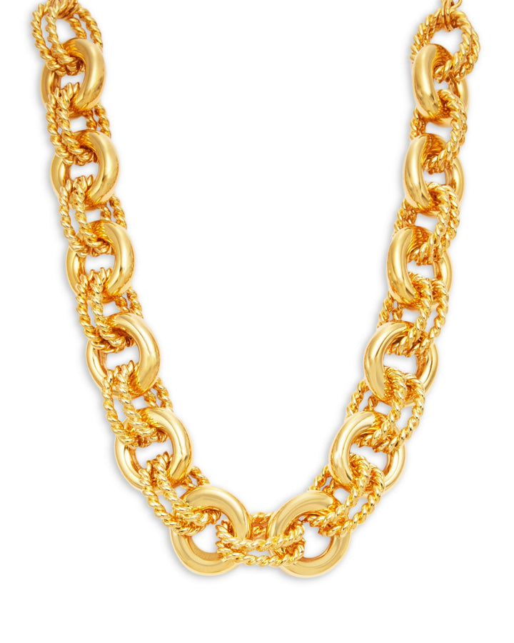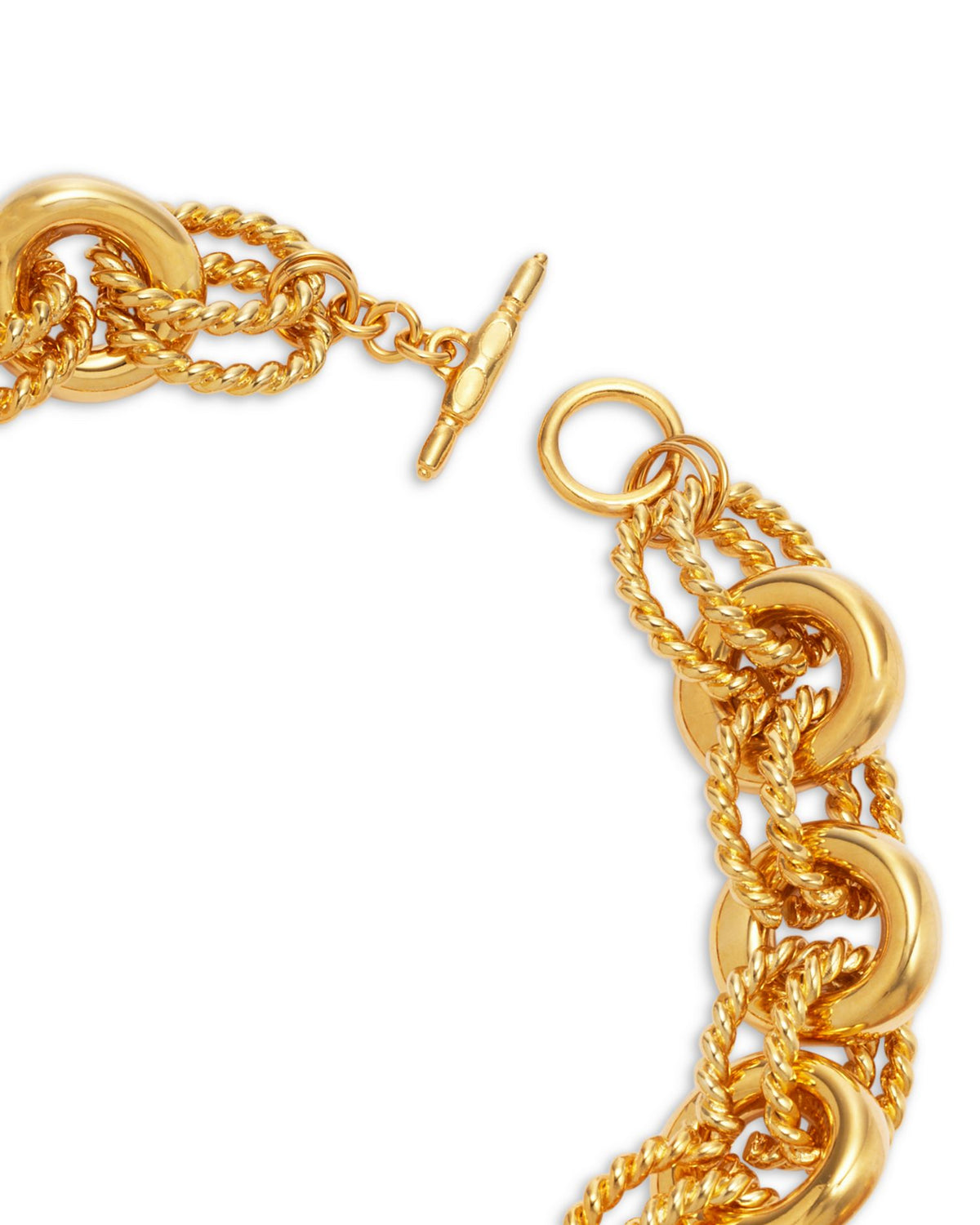 This Donut Link Necklace by Kenneth Jay Lane is a bold and unique design, featuring oversized donut-shaped links with a radiant 22K gold-plated finish. Its toggle closure adds a modern touch, making it perfect for statement styling.