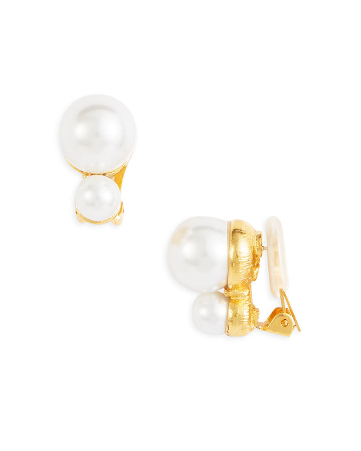 These Imitation Pearl Clip On Earrings by Kenneth Jay Lane are a timeless and versatile accessory, featuring luminous glass pearls in a radiant 22K electroplated setting. Their clip-on design ensures effortless elegance for non-pierced ears.