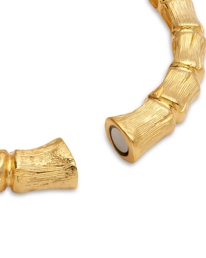 This Bamboo Bangle Bracelet by Kenneth Jay Lane is a bold and textured design inspired by natural bamboo. Finished in luxurious 22K gold plating, it features a magnetic closure for easy wear and elegant styling.