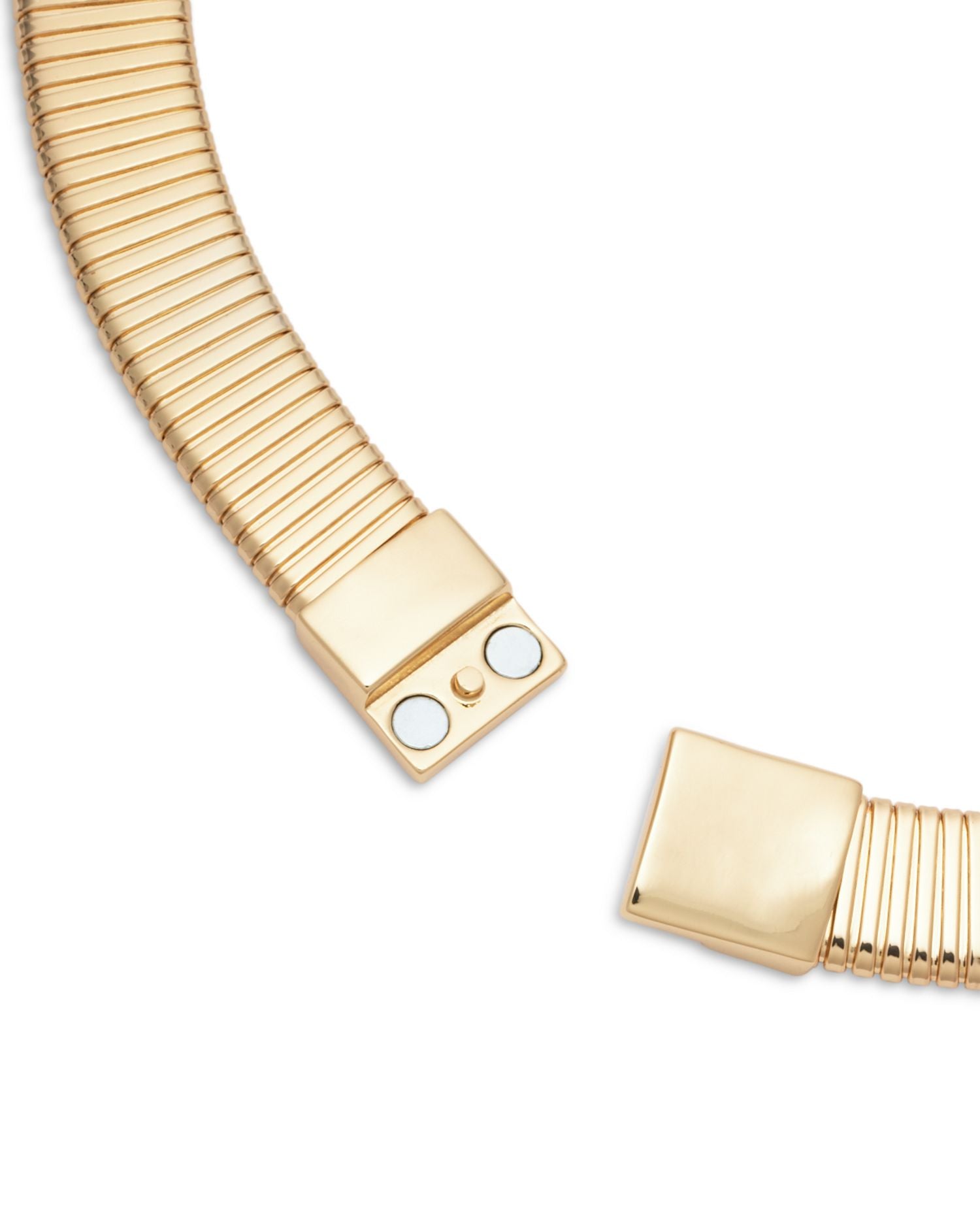This Flat Stretch Collar Necklace by Kenneth Jay Lane is a sleek and modern piece, featuring a smooth 14K gold-plated design that lies elegantly against the collarbone. Its magnetic closure ensures secure and effortless wear.