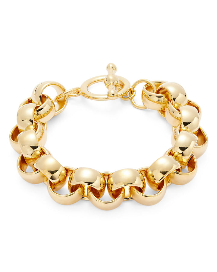 This Chain Bracelet by Kenneth Jay Lane is a striking and versatile piece, featuring bold chain links with a luxurious 20K gold-plated finish. Its toggle closure ensures easy wear, making it perfect for layering or wearing solo.