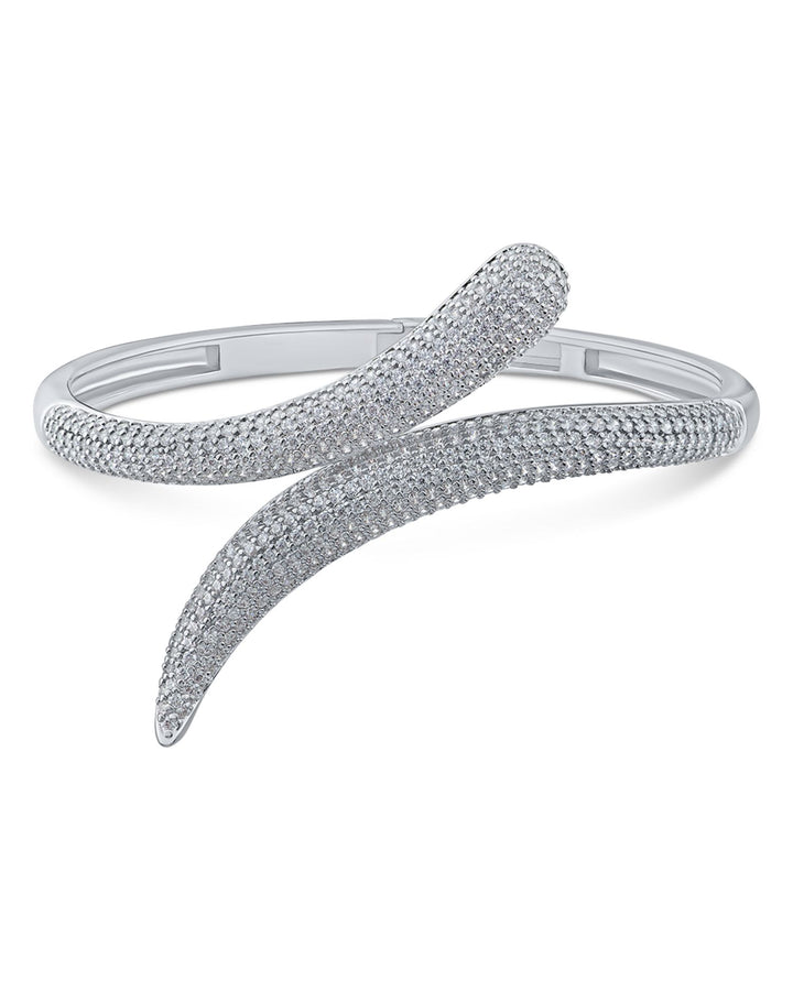 Crafted in rhodium-plated brass with pavé-set cubic zirconia. Features a hinge closure and measures 2.5" in diameter. Rhodium plating may require special care to maintain its luster.
