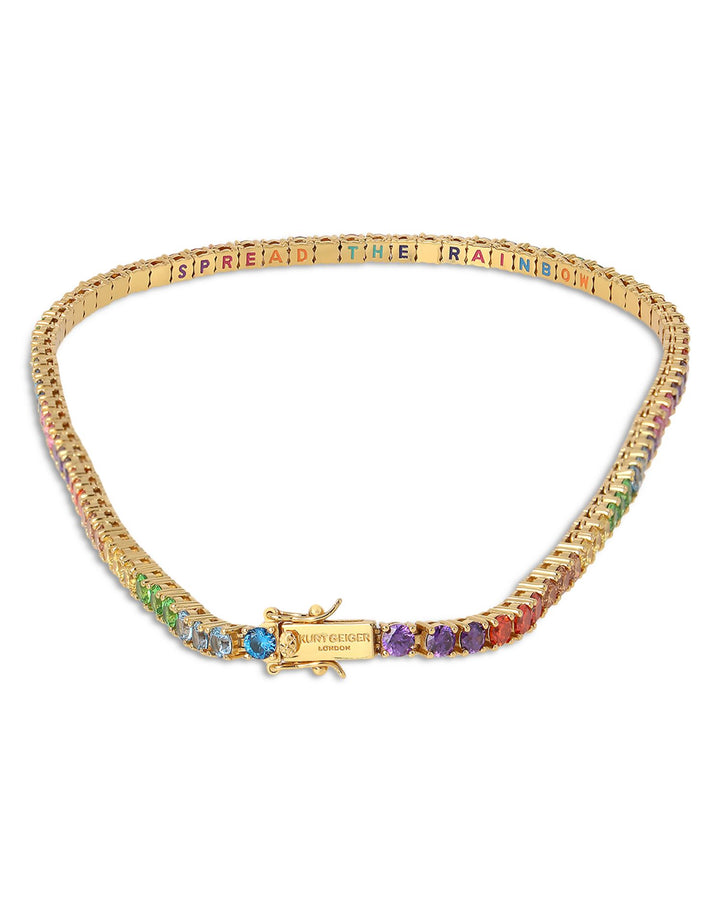 This Rainbow Crystal Tennis Necklace, 16" by Kurt Geiger London is a dazzling reimagining of a classic tennis necklace. With its vibrant rainbow-hued crystals, this piece makes a bold statement while maintaining an air of sophistication. Perfect for adding a pop of color to any outfit.