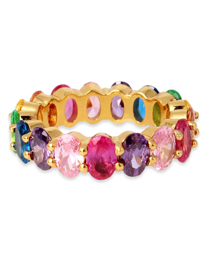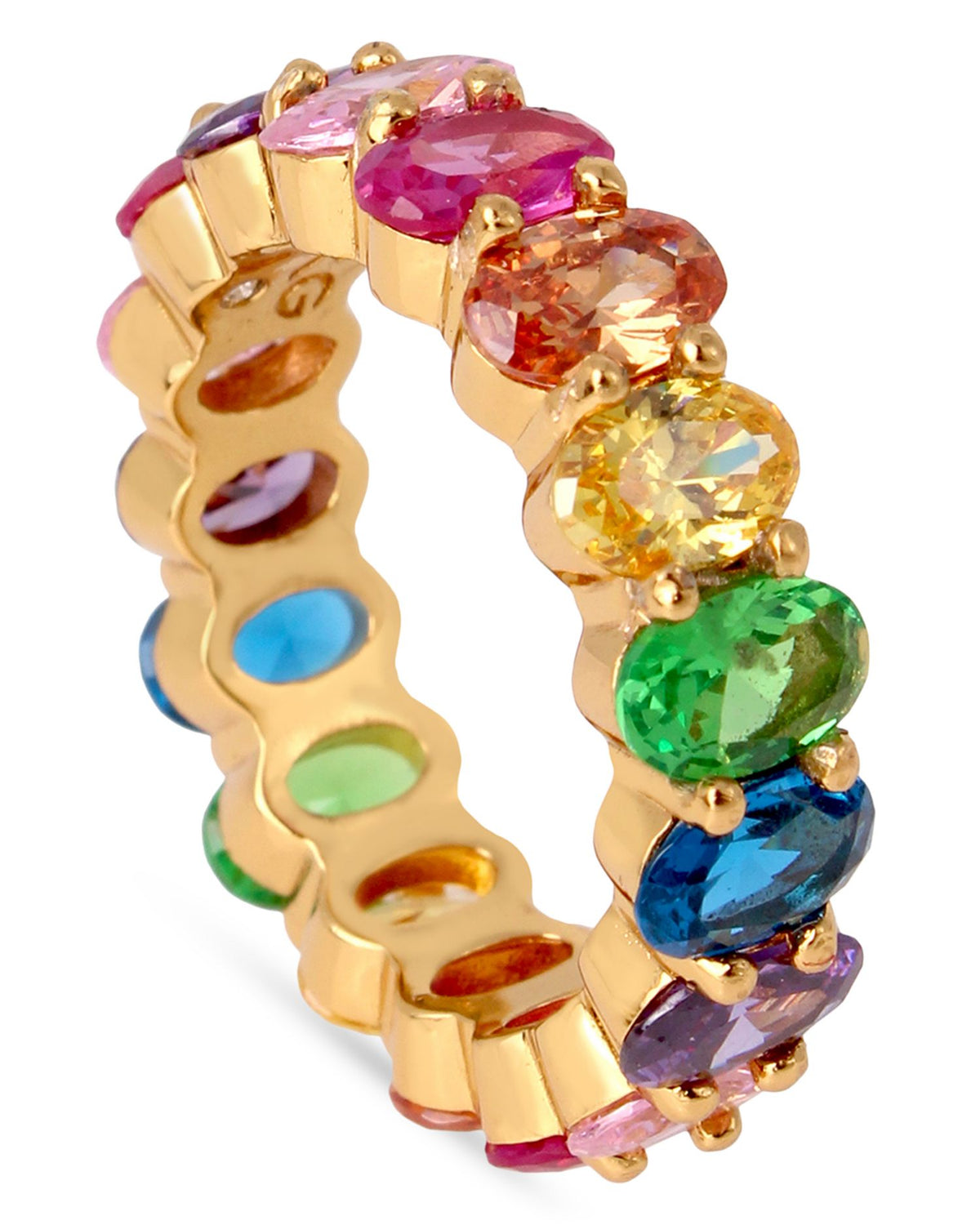 This Rainbow Crystal Band Ring by Kurt Geiger London combines sleek design with vibrant multicolor crystals for a playful yet elegant accessory. Perfect for stacking or wearing as a standalone statement piece.