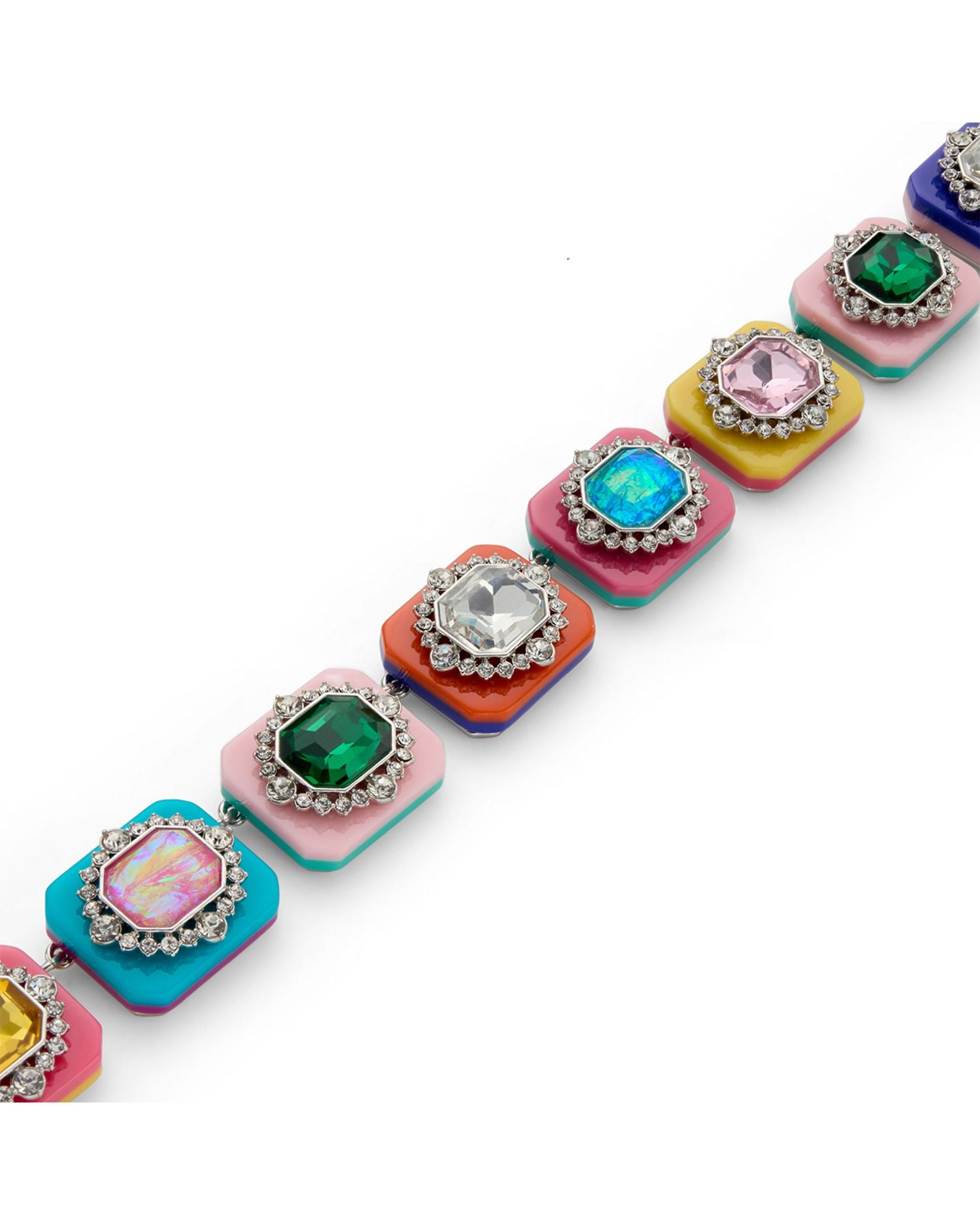 Crafted from rhodium-plated brass with resin and glass crystals. Features a lobster clasp closure, adjustable length of 16"-18", and a frontal length of 0.75".
