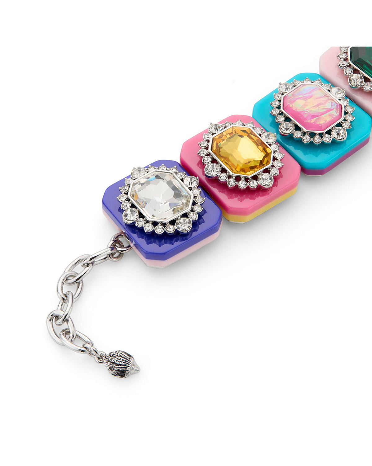 Crafted in rhodium-plated metal with resin and glass crystals. Measures 7' in length with a 1' extension and a lobster clasp closure.