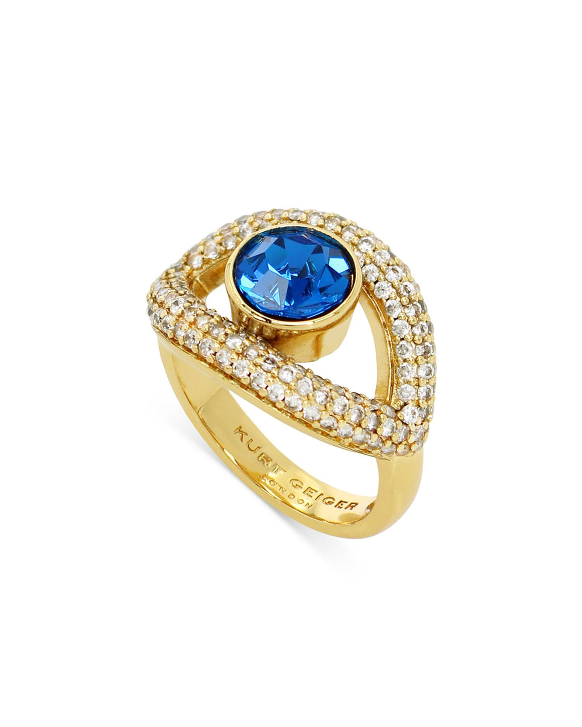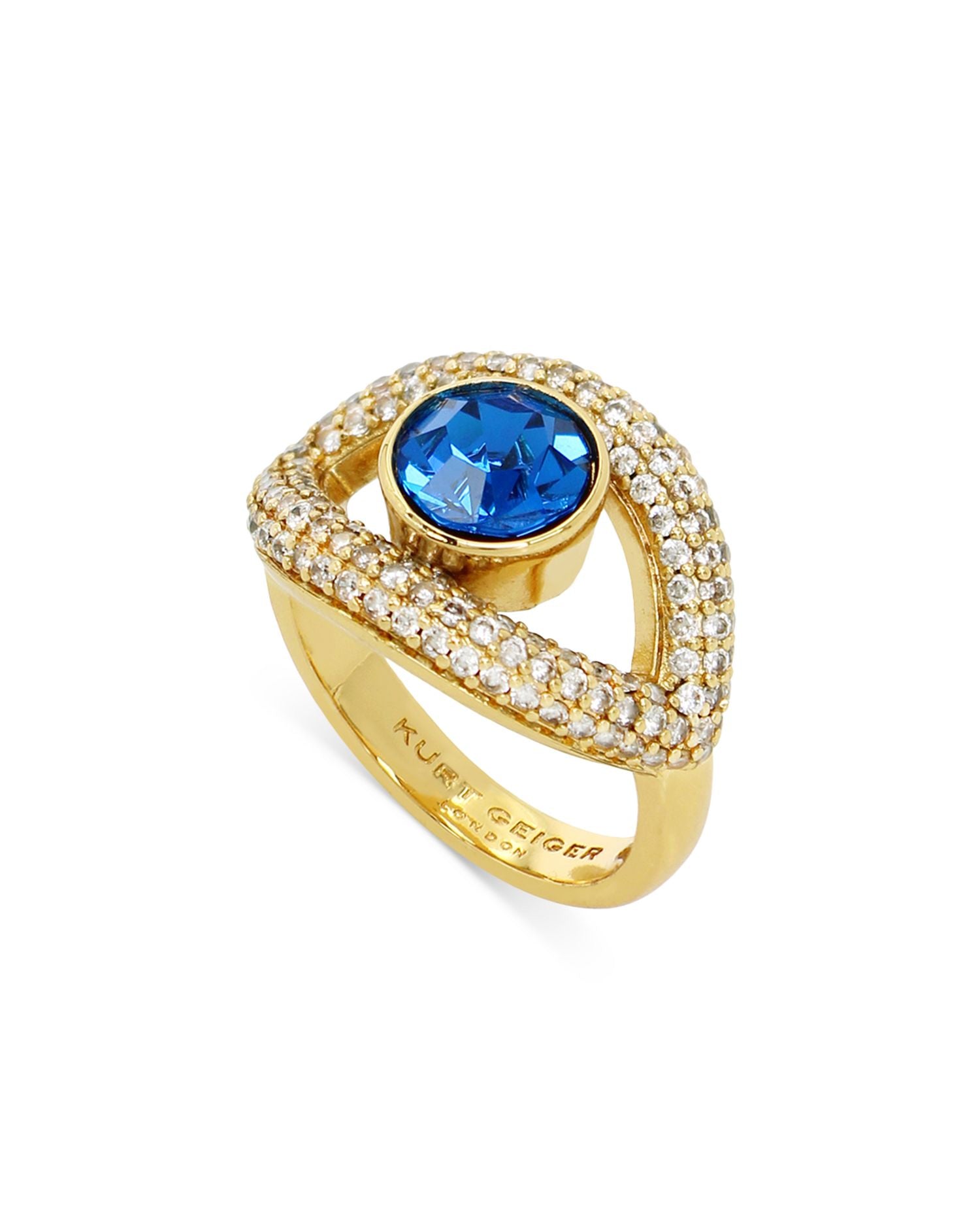 This Pavé & Blue Crystal Evil Eye Cocktail Ring in Gold Tone by Kurt Geiger London combines symbolic elegance with modern sophistication. The striking evil eye motif, adorned with pavé-set crystals and a vibrant blue accent, makes this ring a statement piece perfect for any occasion.