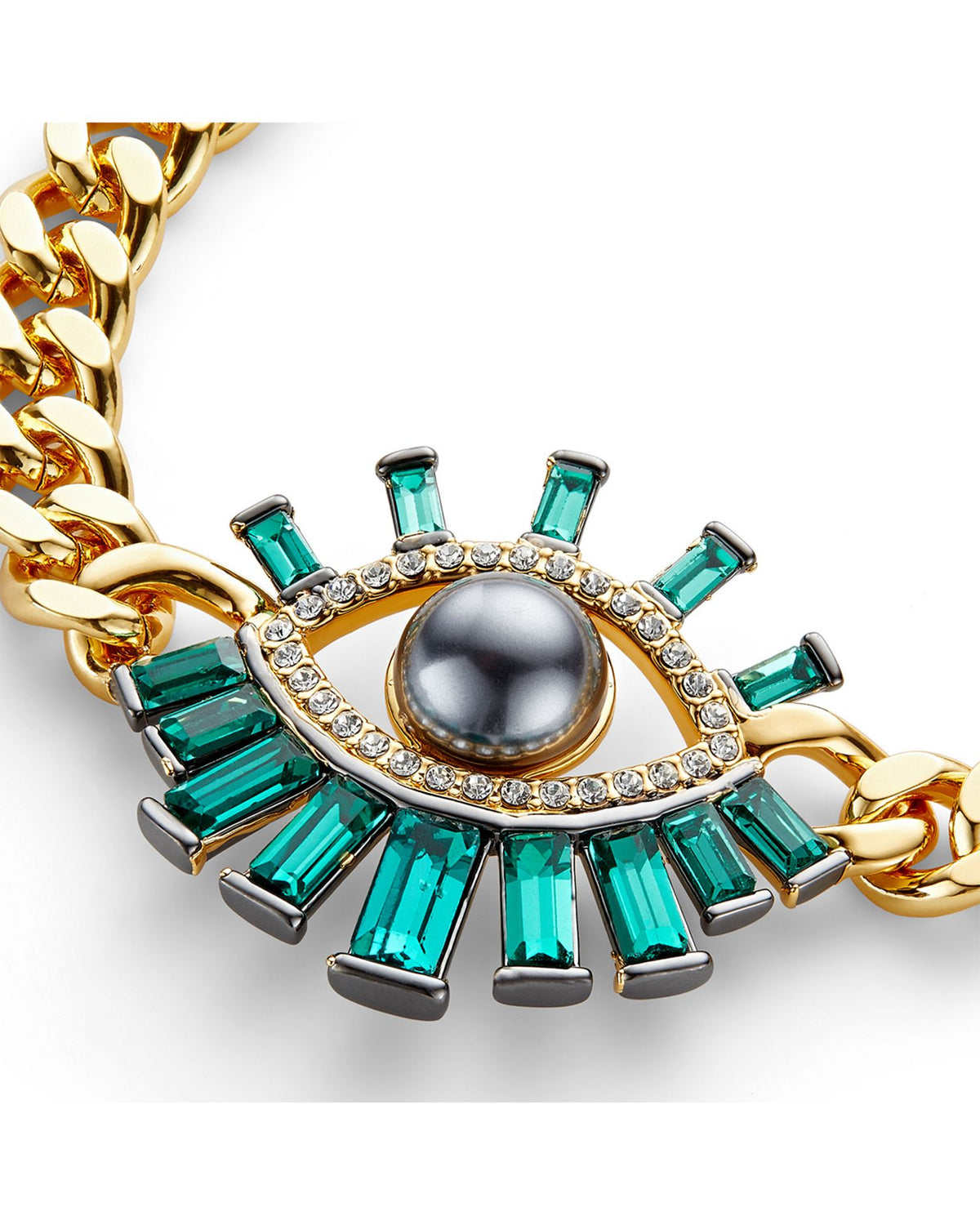This Crystal & Imitation Pearl Evil Eye Curb Chain Bracelet, 16'-18' by Kurt Geiger London is a striking blend of elegance and symbolism. The centerpiece features sparkling crystals and a lustrous imitation pearl, making it a statement piece perfect for layering or wearing alone.