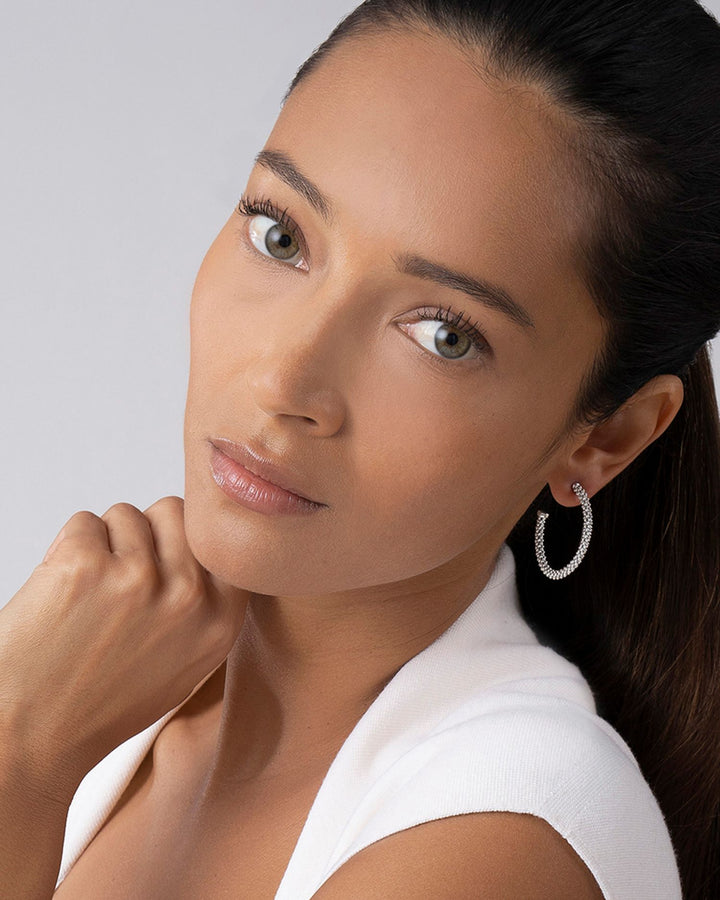These Beaded Thin Hoop Earrings in Sterling Silver, 28mm by LAGOS bring a sleek and elegant aesthetic to your look. Designed with signature Caviar beading, these thin hoops are versatile for both casual and formal wear.