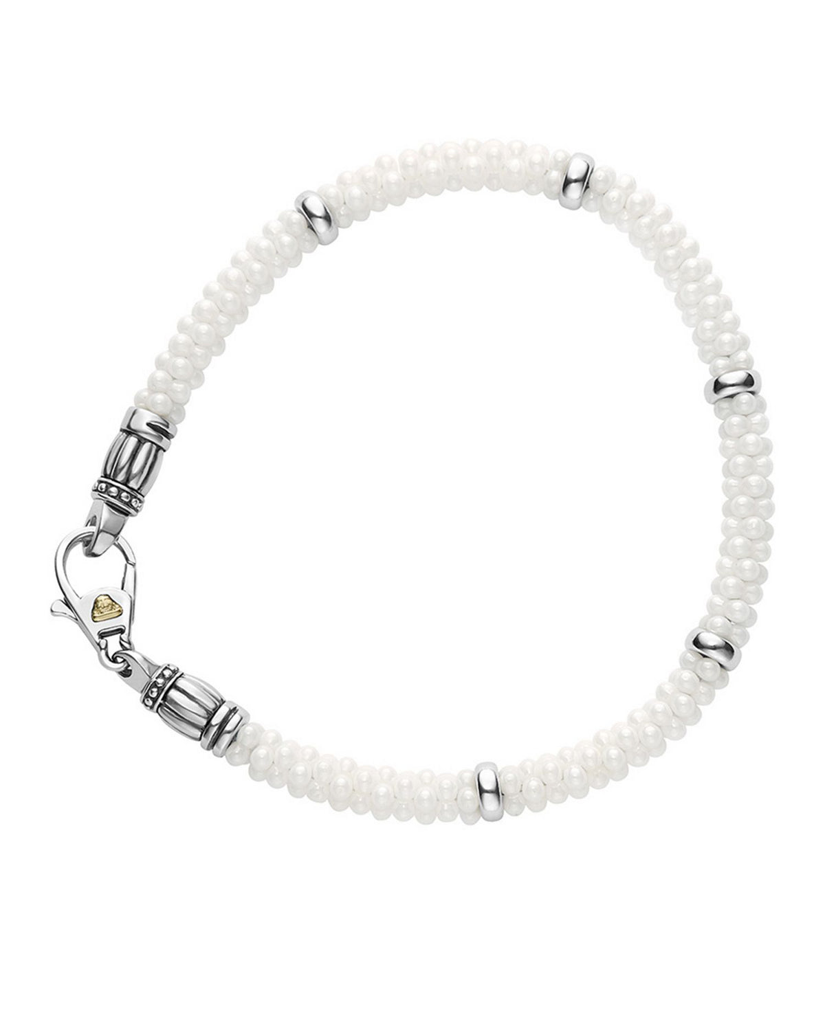 These Sterling Silver White Caviar Bracelets by LAGOS showcase the iconic Caviar beading, reimagined with white ceramic accents and gleaming sterling silver bars. Each piece embodies the timeless elegance of the LAGOS aesthetic.