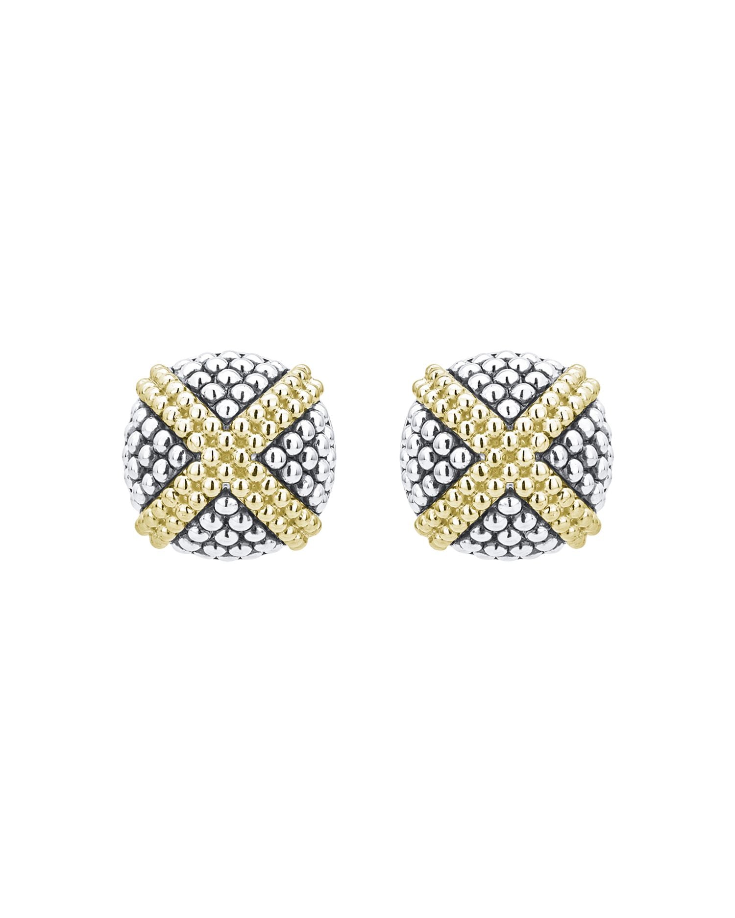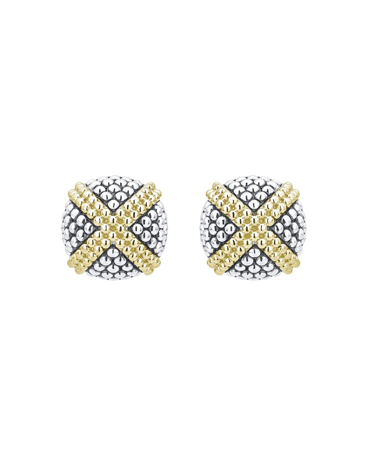 These 18K Yellow Gold & Sterling Silver Signature Caviar Square Earrings by LAGOS from the Signature Caviar collection combine geometric sophistication with timeless elegance. Featuring sterling silver squares adorned with signature Caviar beading and accented by bold 18K yellow gold X's, these earrings offer a chic and versatile design.