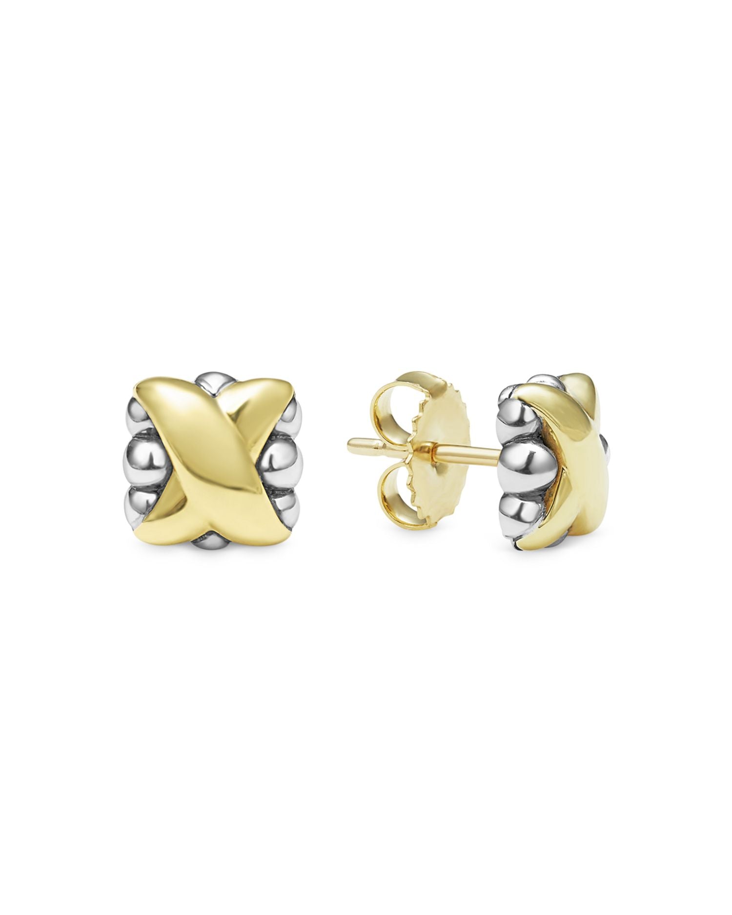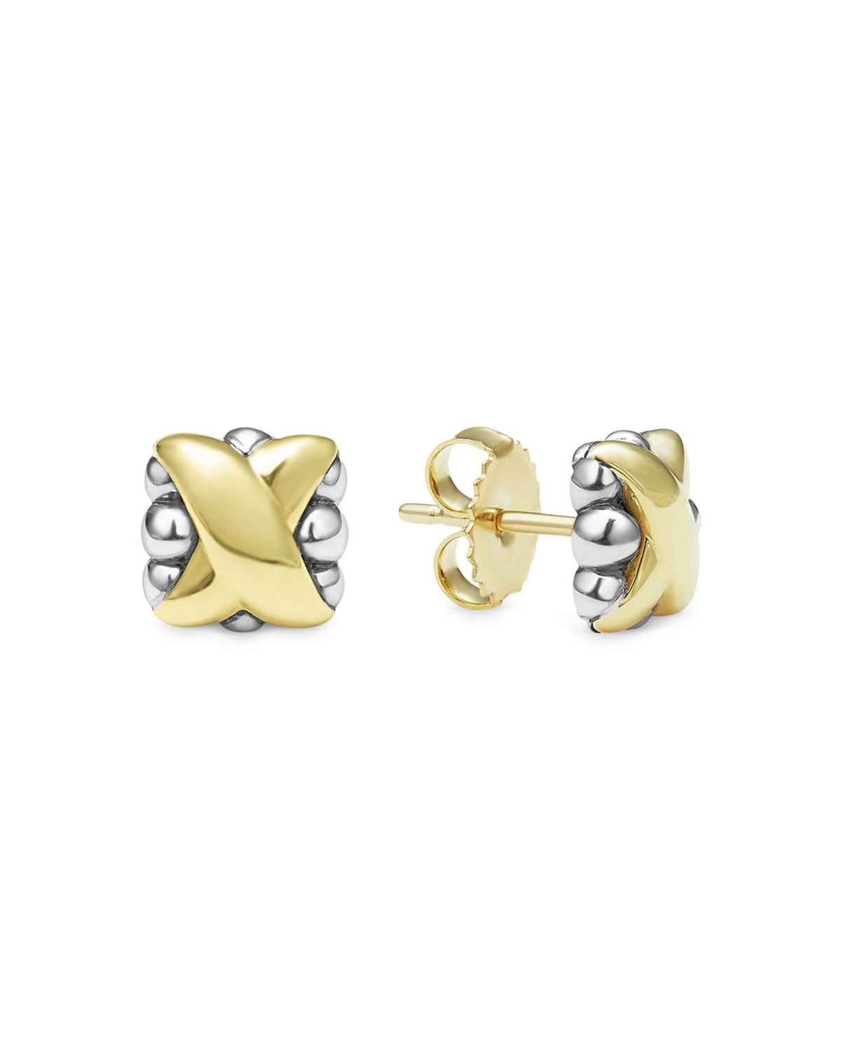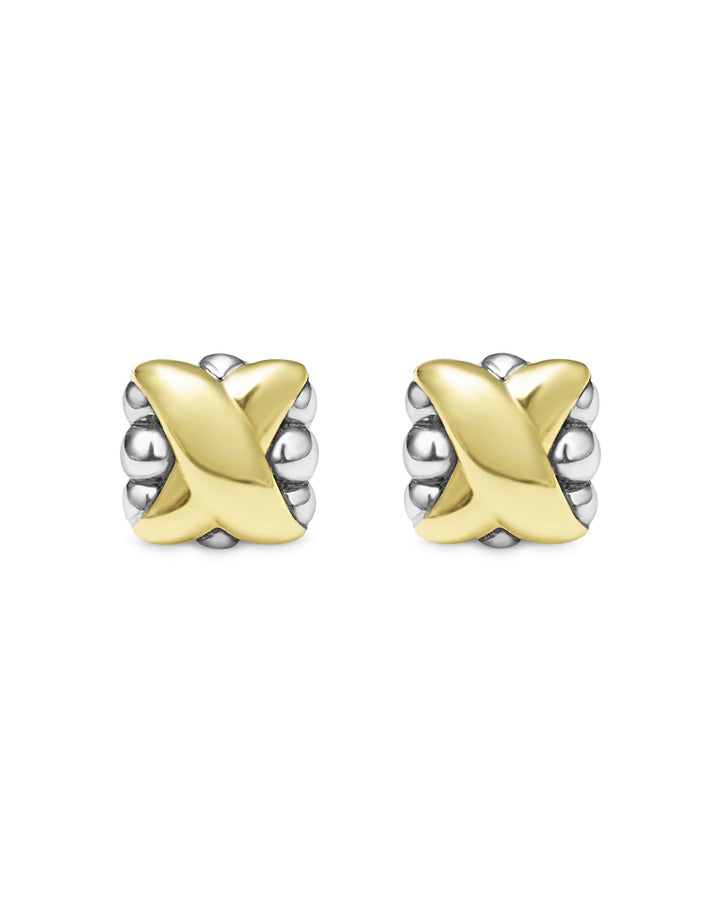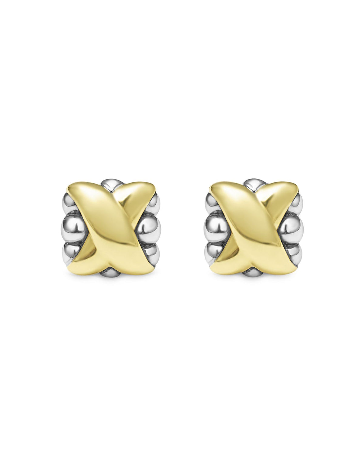 These 18K Yellow Gold & Sterling Silver Embrace X Bead Stud Earrings by LAGOS from the Embrace collection feature polished 18K yellow gold Xs floating gracefully over sterling silver bead clusters. A versatile two-tone design that adds elegance to everyday wear.