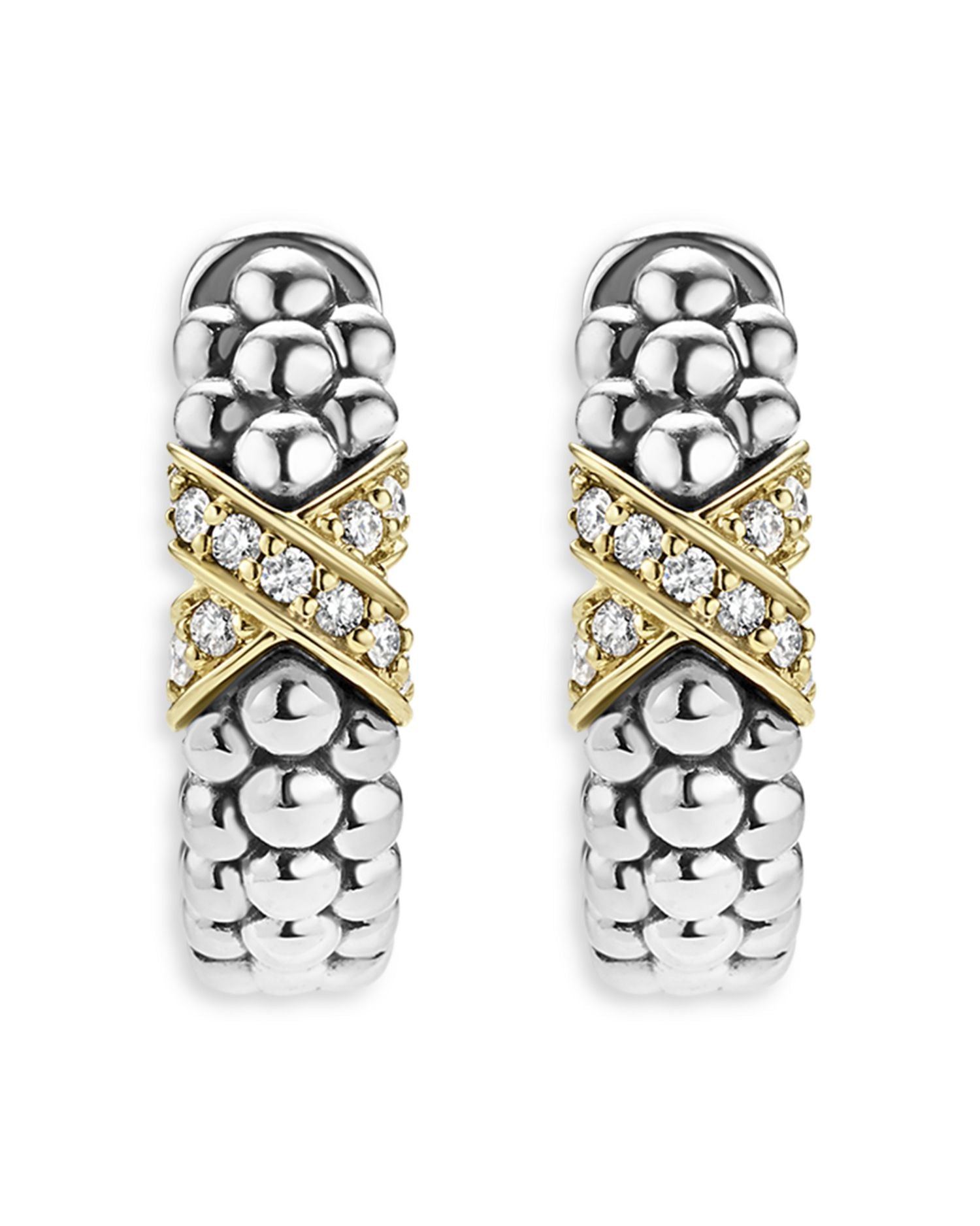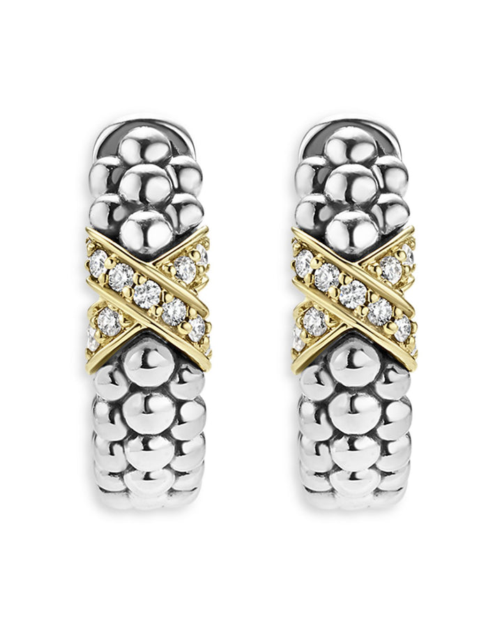 These 18K Yellow Gold & Sterling Silver Embrace Diamond X Small Hoop Earrings by LAGOS from the Embrace collection are chic and refined. Featuring sparkling diamonds set in 18K yellow gold Xs, these small hoops with Caviar bead details are ideal for adding a touch of luxury to any look.