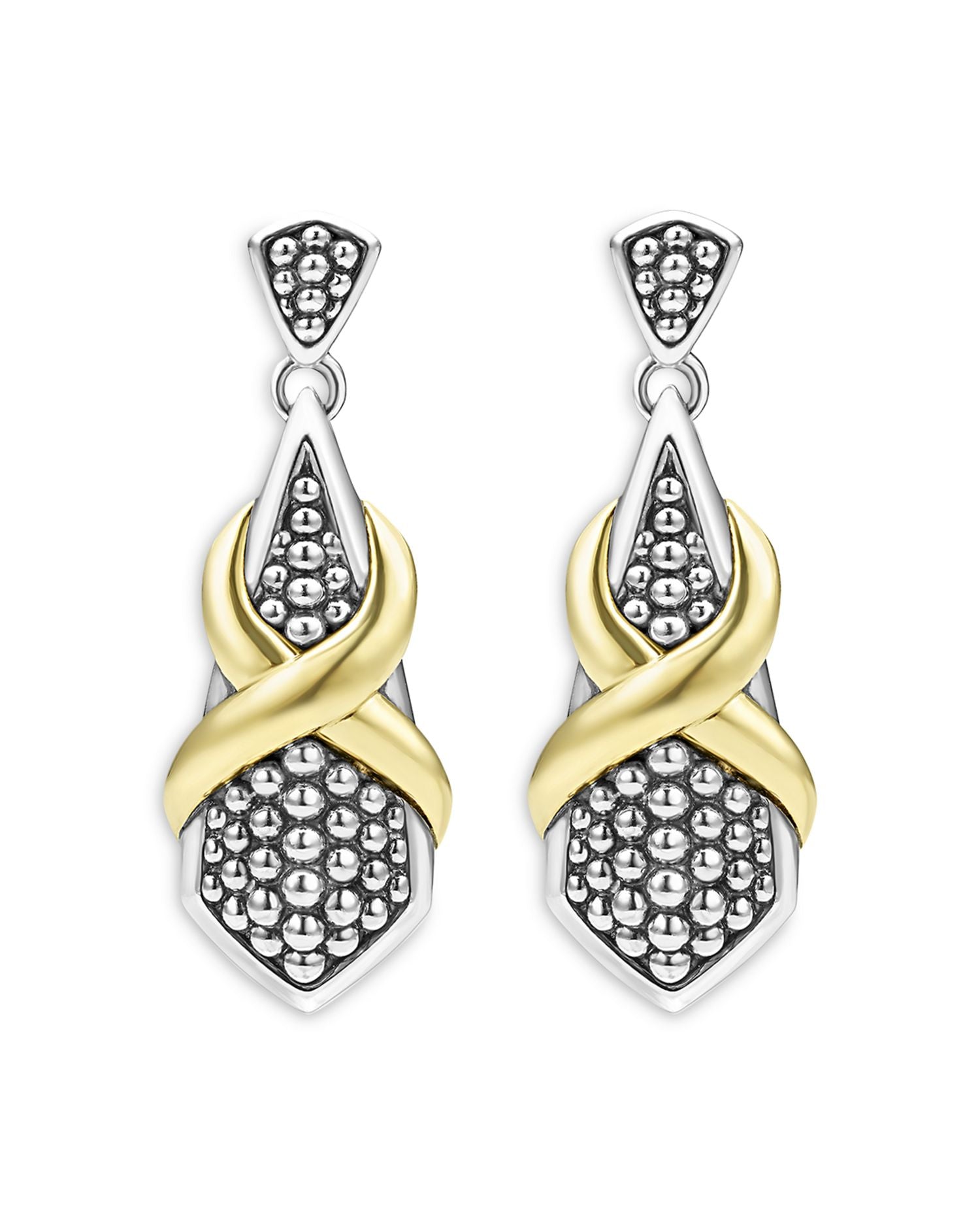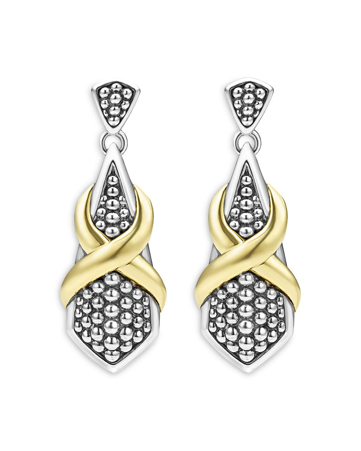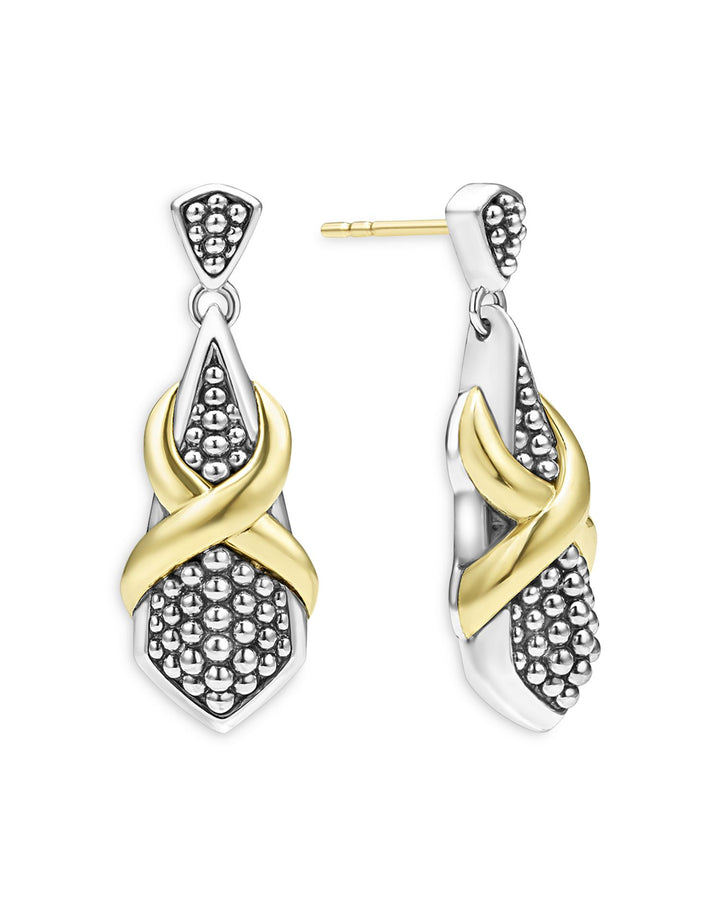 These 18K Yellow Gold & Sterling Silver Embrace X Caviar Bead Drop Earrings by LAGOS from the Embrace collection offer a dramatic and stylish look. Featuring polished 18K yellow gold Xs and sterling silver Caviar beading, these drop earrings exude modern elegance. Perfect for both casual and formal occasions.