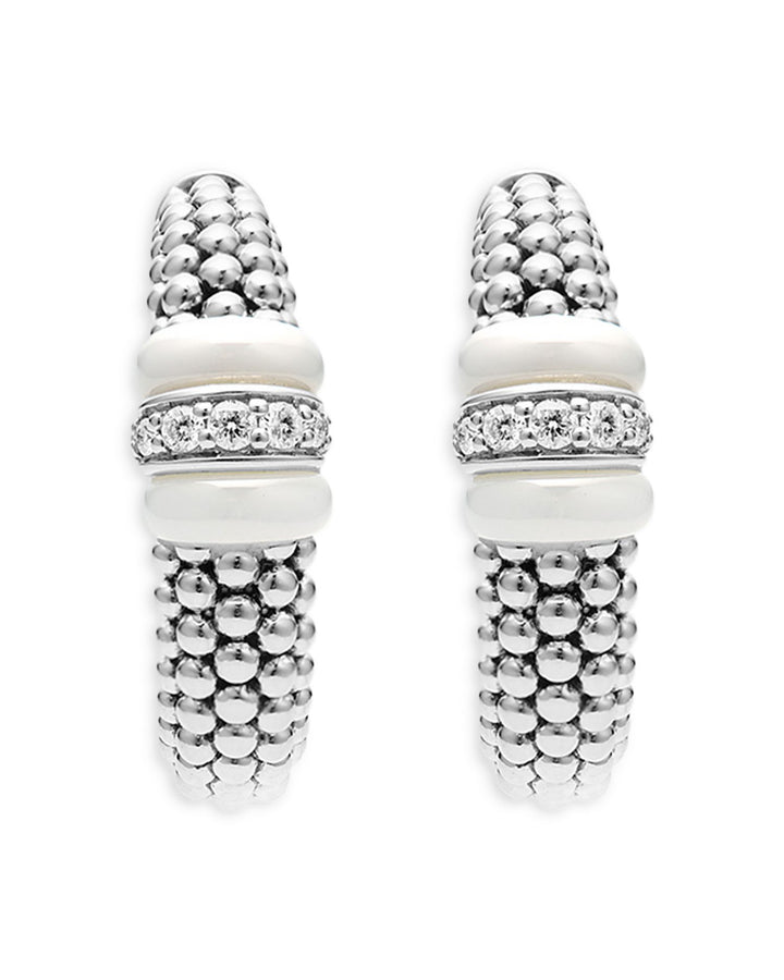 These Ceramic & Sterling Silver White Caviar Diamond Hoop Earrings by LAGOS from the White Caviar collection combine modern ceramic accents with rows of pavé diamonds. The sleek design and luxurious texture make them a bold and elegant addition to any jewelry collection.