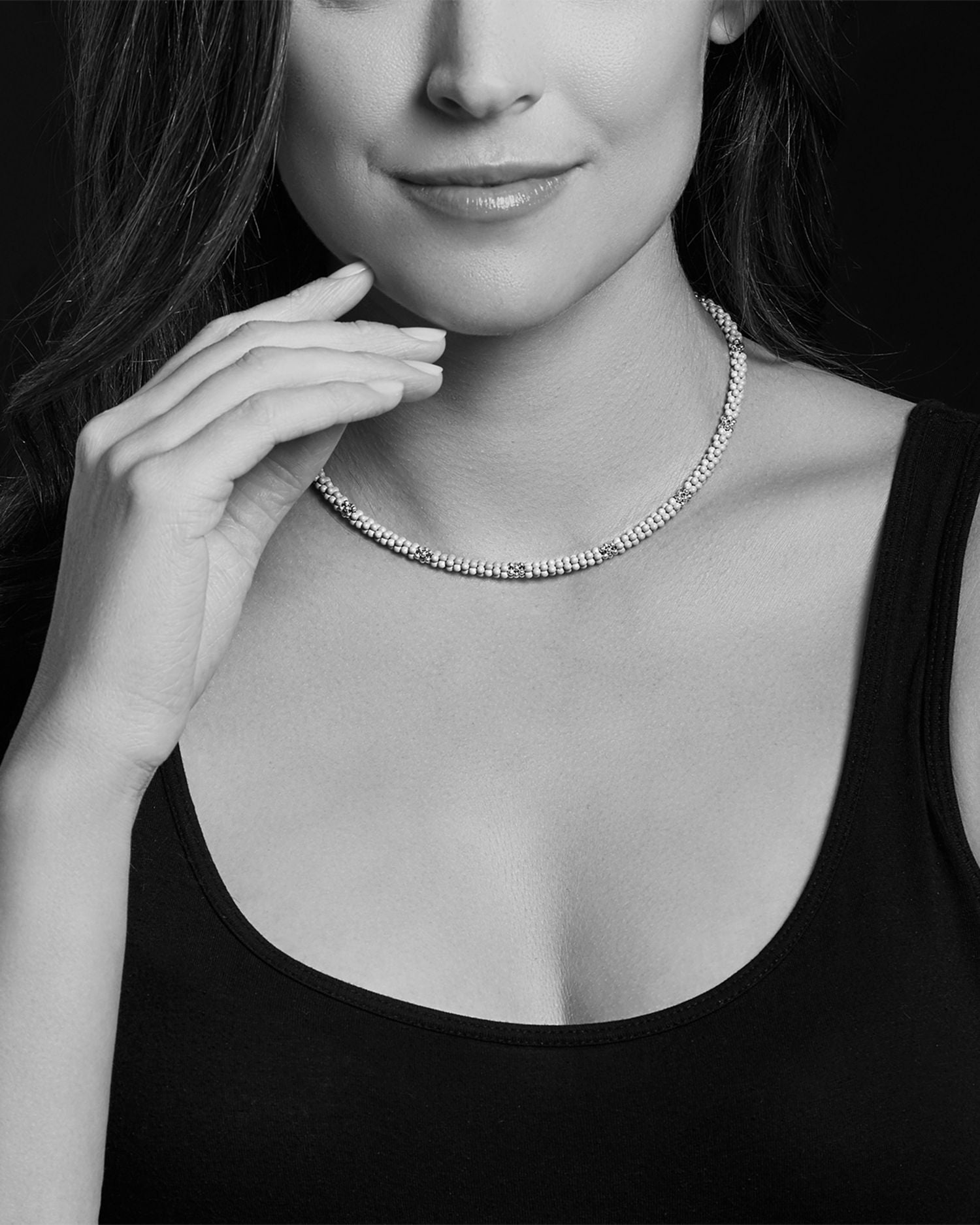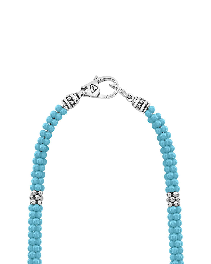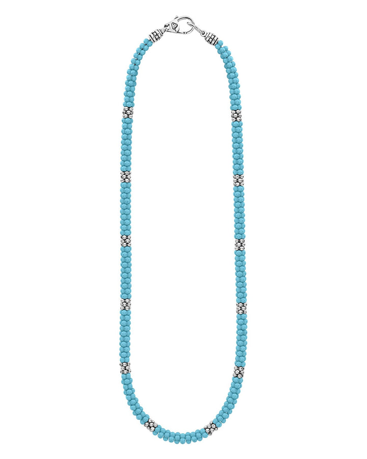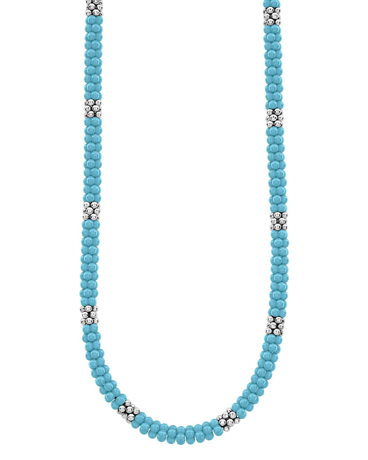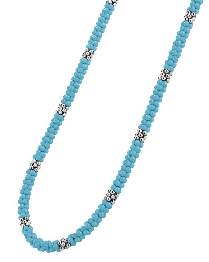 This Sterling Silver Caviar Blue Caviar Ceramic Beaded Necklace, 16" by LAGOS from the Blue Caviar collection offers a vibrant twist to the brand's iconic Caviar design. Featuring striking blue ceramic beads and sterling silver accents, this necklace is perfect for pairing with other LAGOS designs.