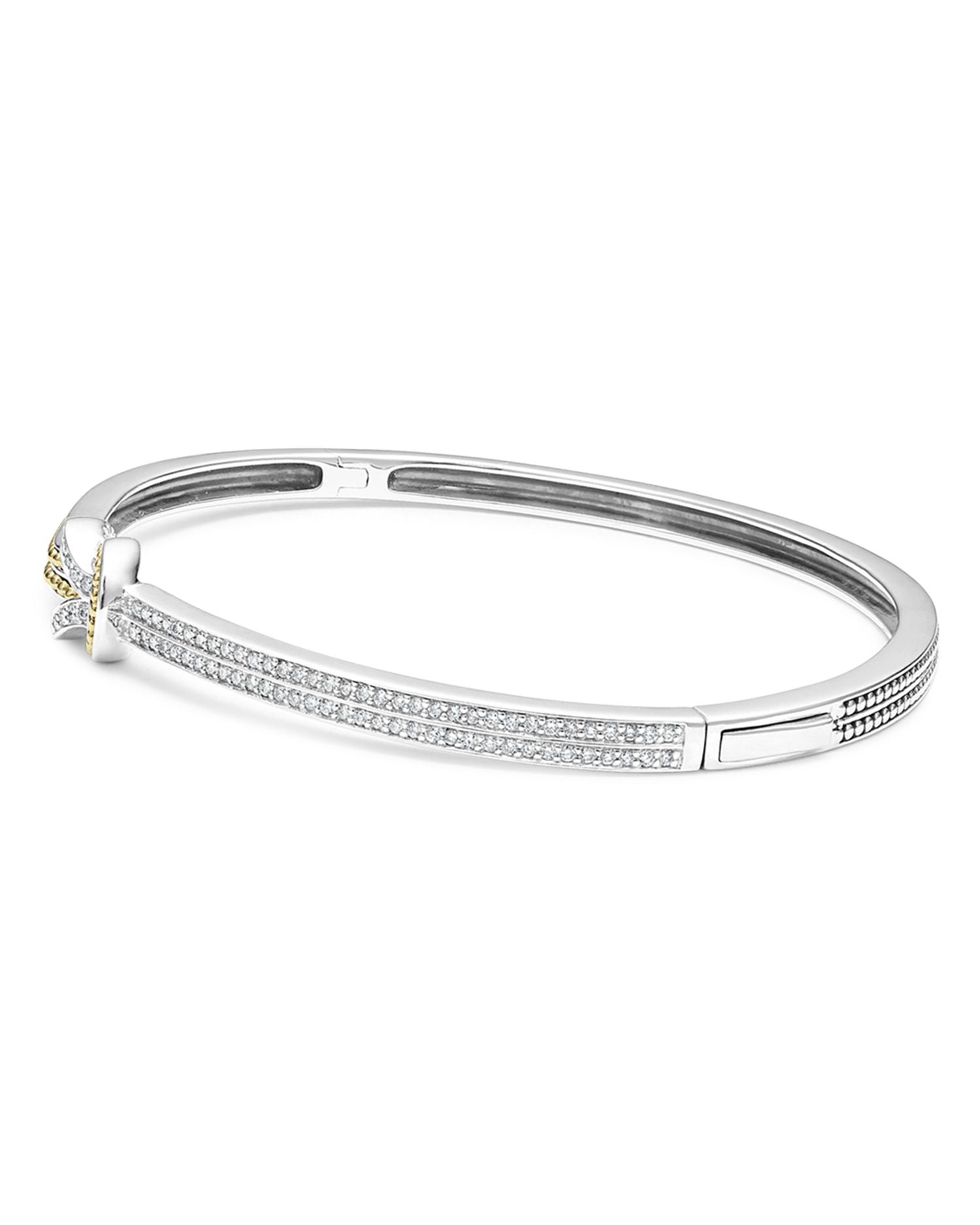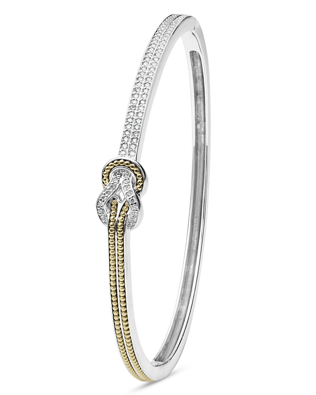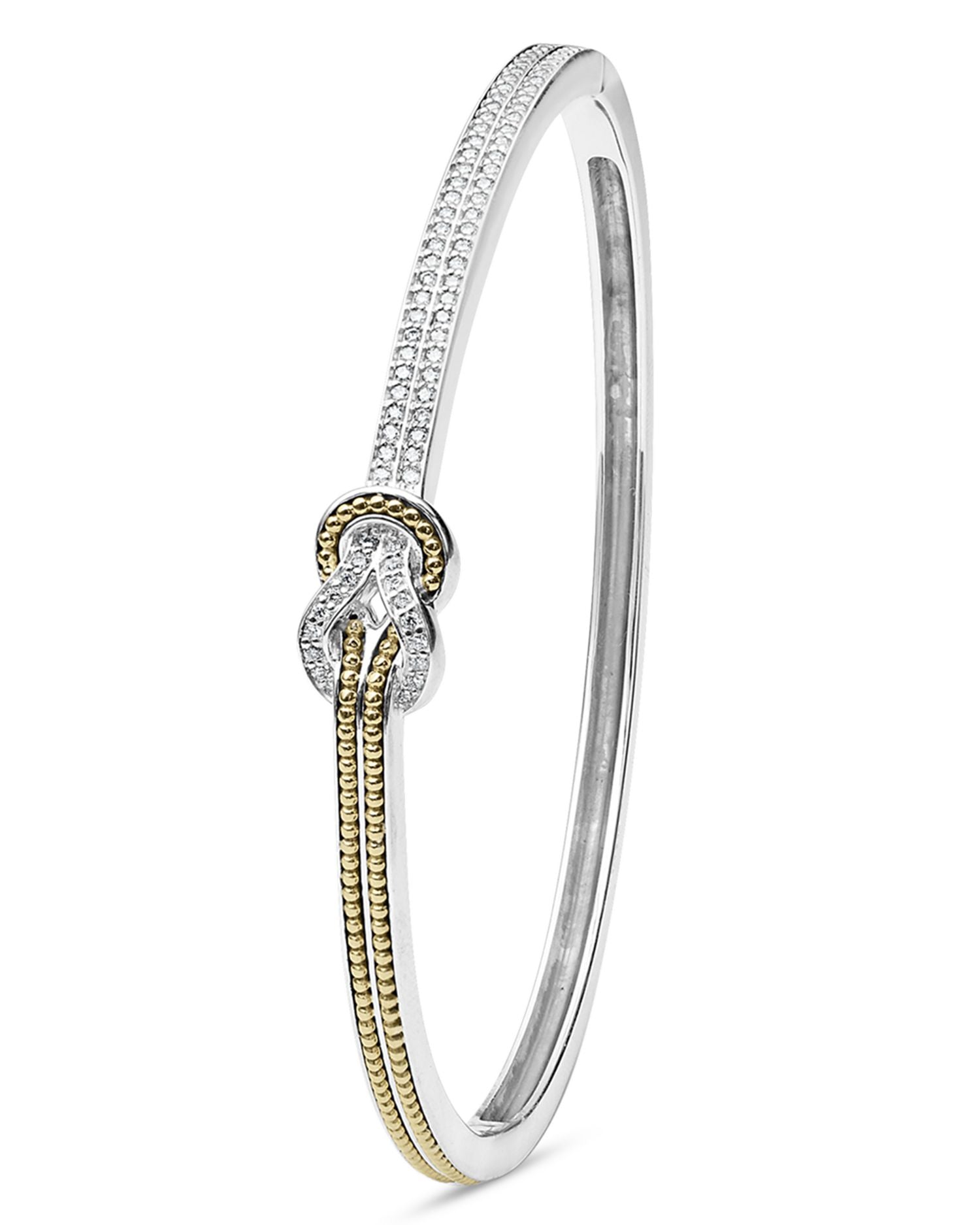 These 18K Yellow Gold & Sterling Silver Newport Diamond Knot Hinged Bangle Bracelets by LAGOS combine elegant Caviar beading with a striking diamond knot motif. These bangles exude glamorous sophistication, perfect for stacking or wearing alone.