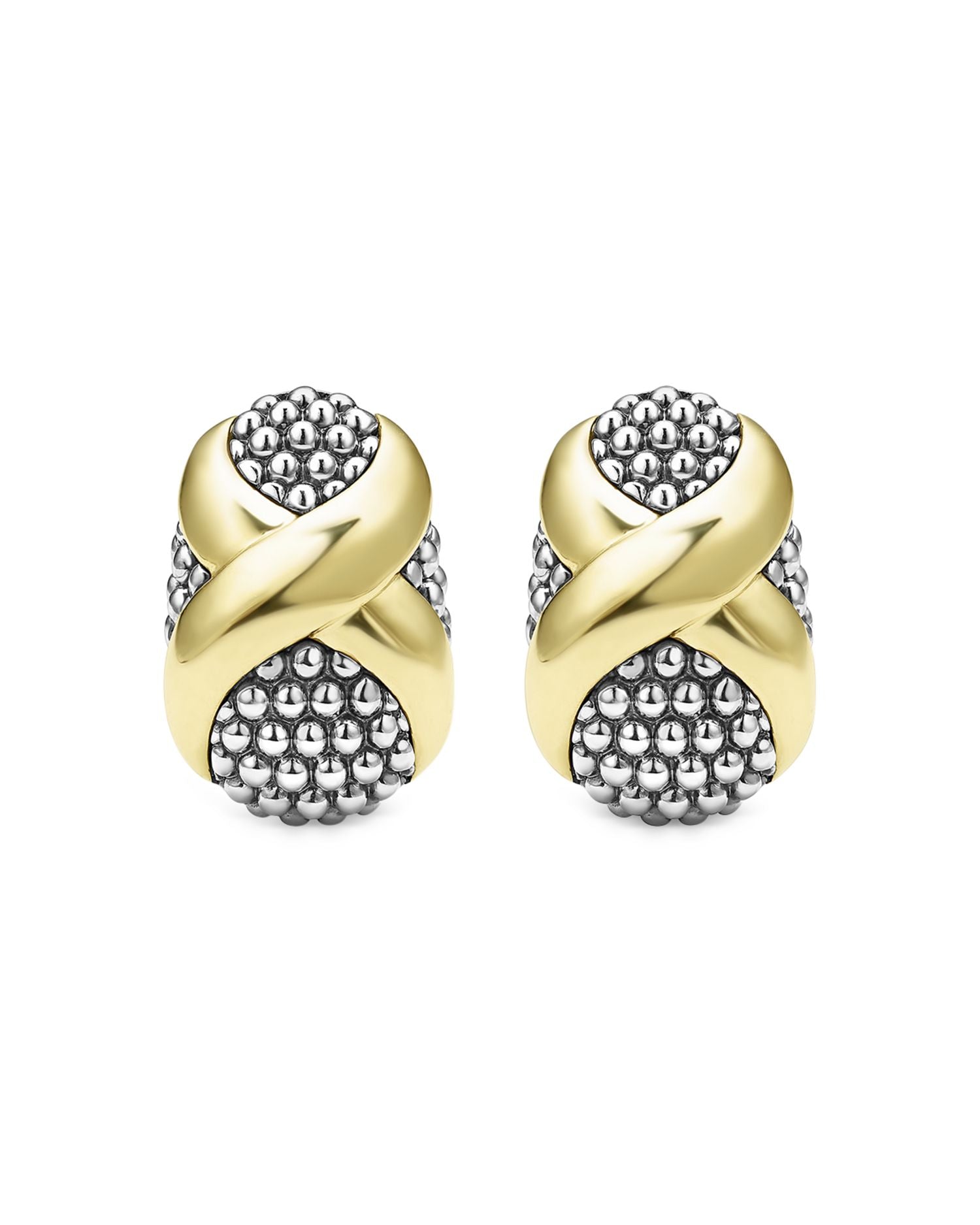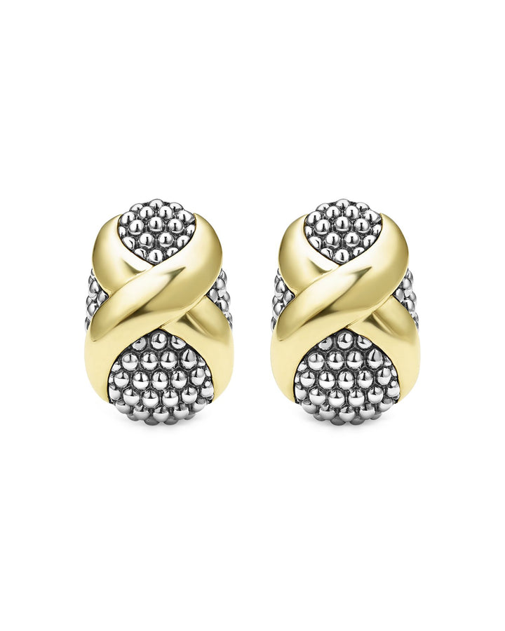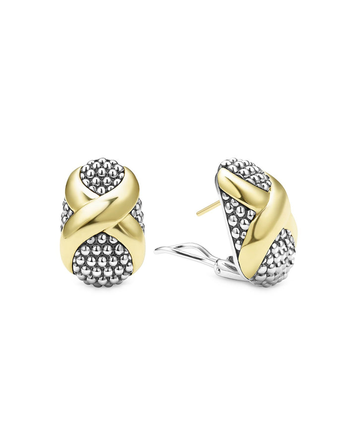 These 18K Yellow Gold & Sterling Silver Embrace X Oval Caviar Bead Omega Earrings by LAGOS from the Embrace collection exude timeless elegance. Featuring yellow gold Xs that provide a luxurious contrast to the oval-shaped sterling silver Caviar beading, these earrings are a versatile addition to any jewelry collection.