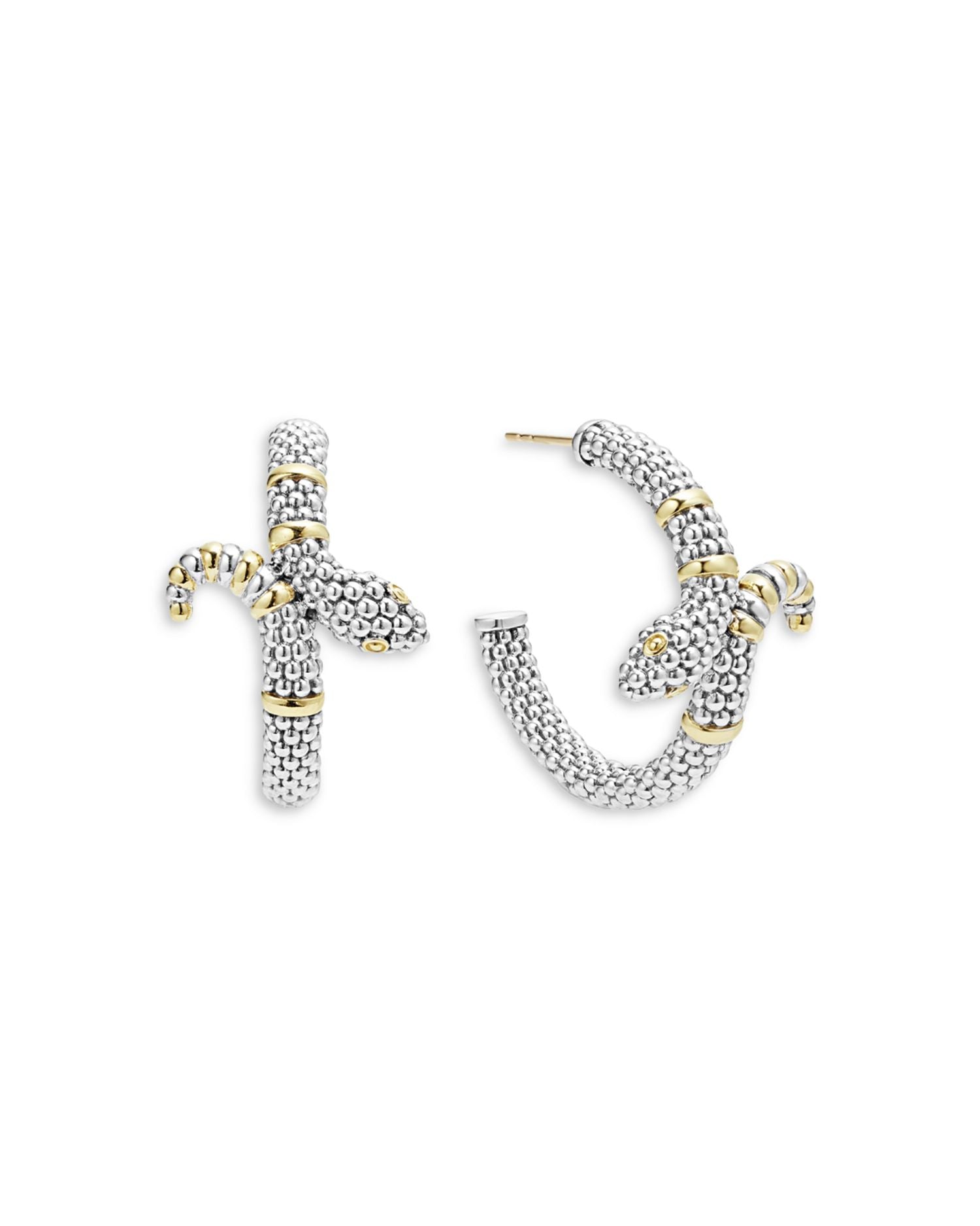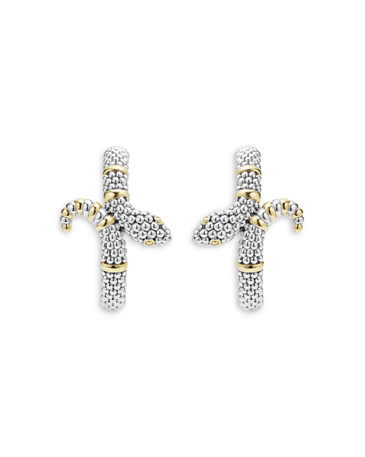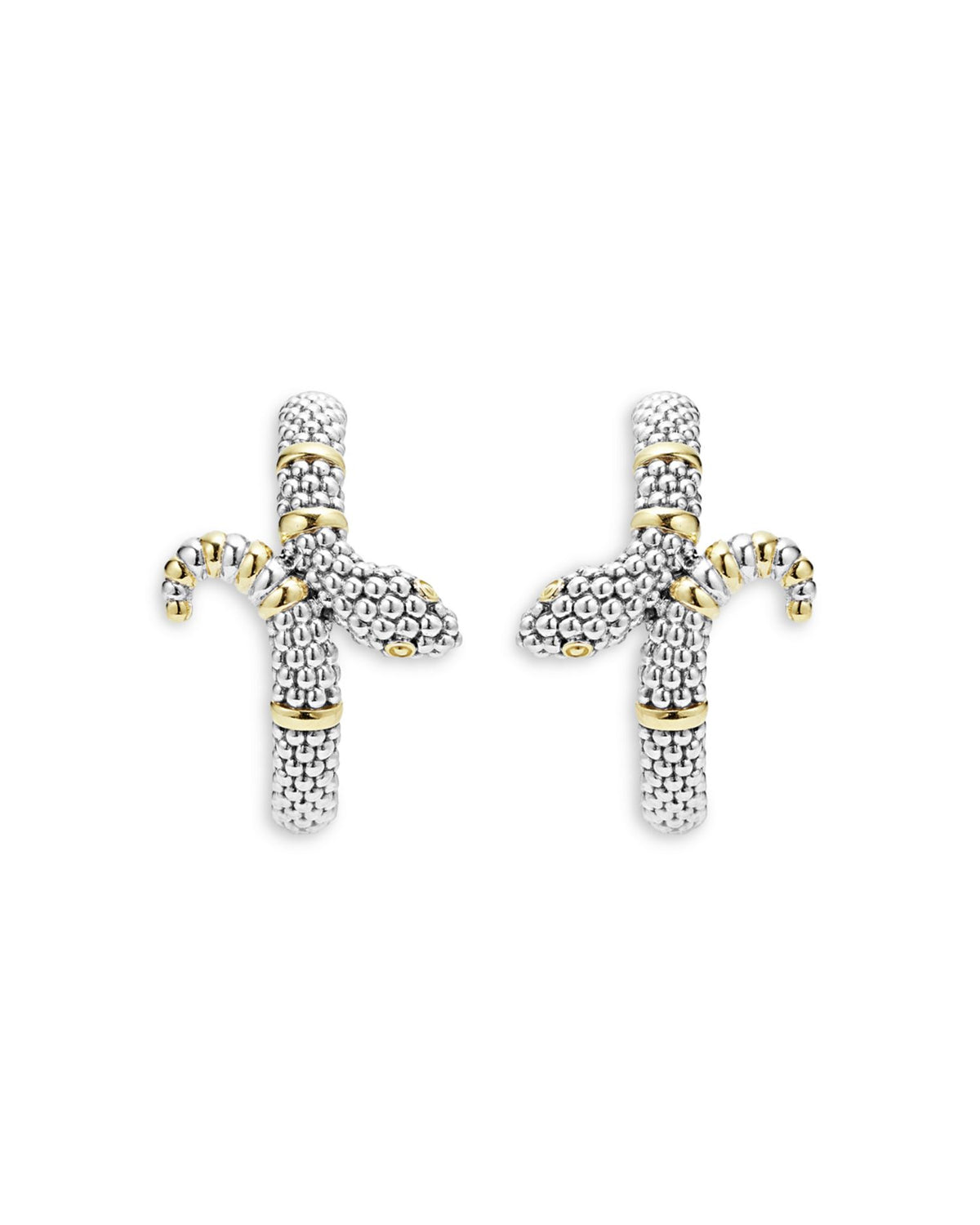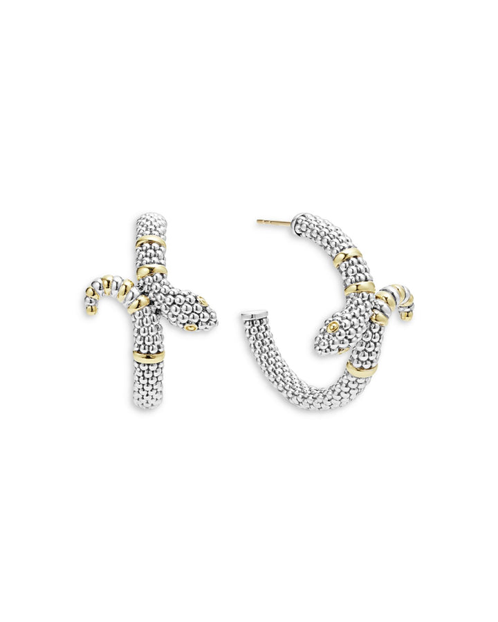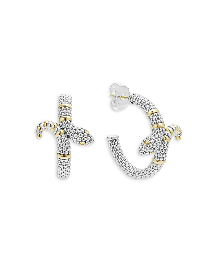 These 18K Yellow Gold & Sterling Silver Rare Wonders Caviar Bead Snake Hoop Earrings by LAGOS from the Rare Wonders collection combine bold design with intricate detailing. The unique snake motif formed by sterling silver Caviar beading and accented with 18K gold stations makes these hoops a standout piece.