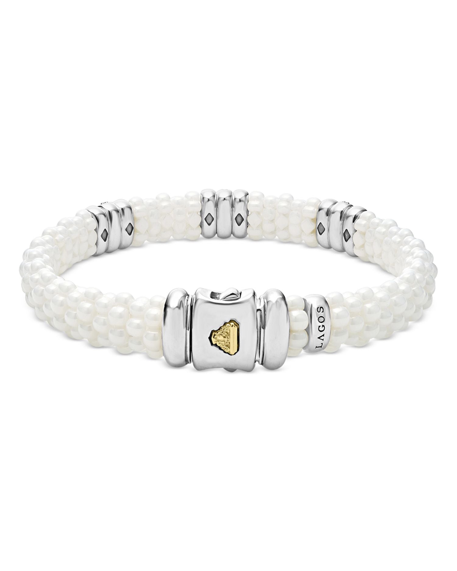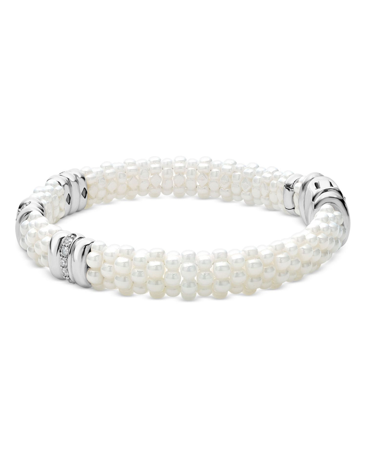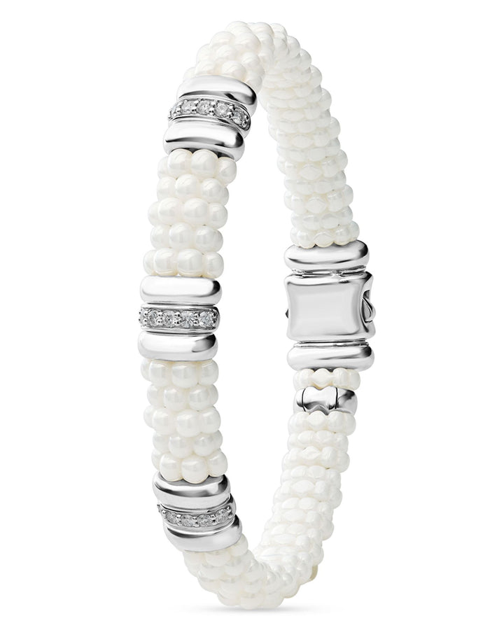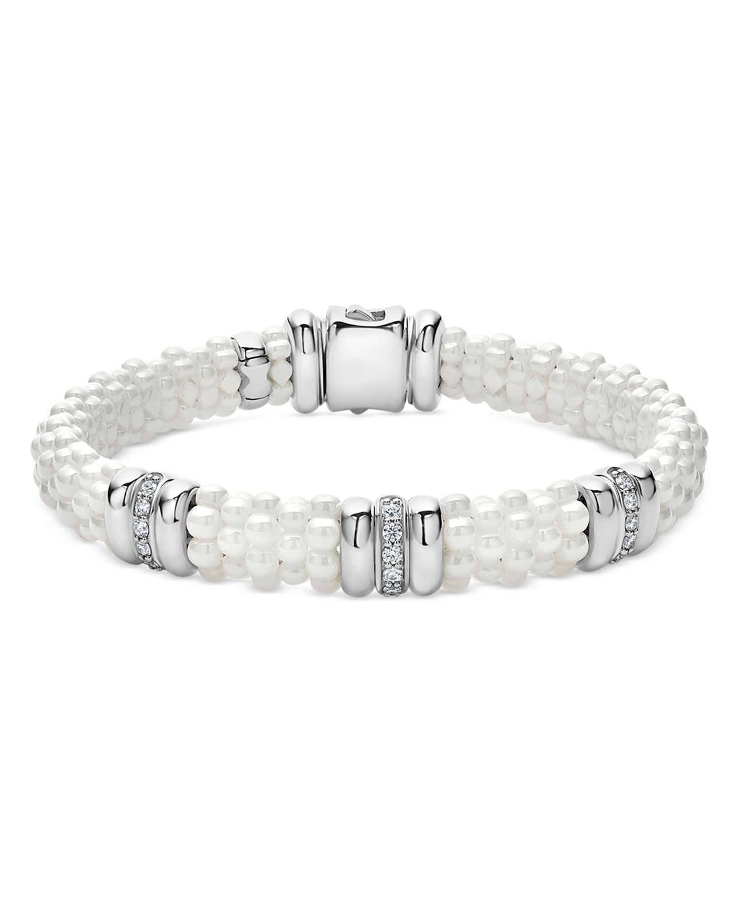 These Sterling Silver & Ceramic White Caviar Diamond Three Station Bracelets by LAGOS bring chic elegance with their ceramic beading and dazzling diamond accents. A modern and sophisticated addition to the White Caviar Collection.