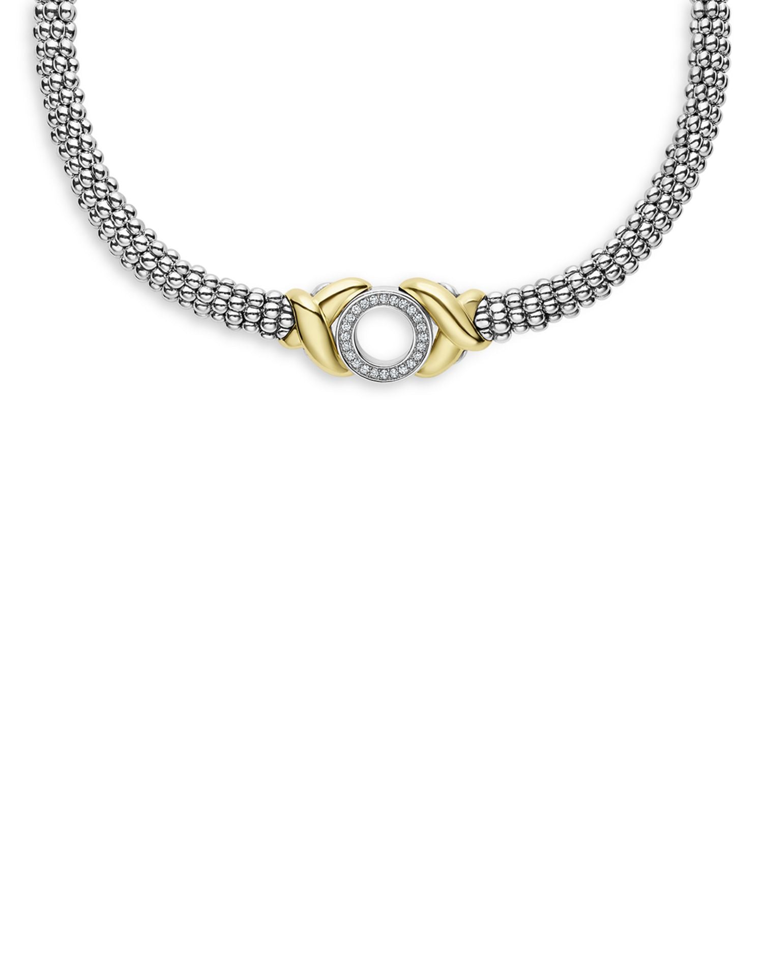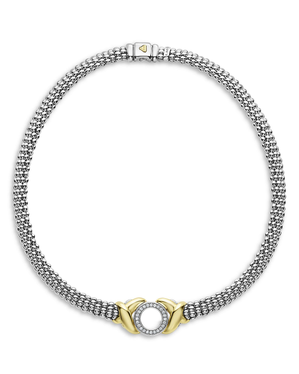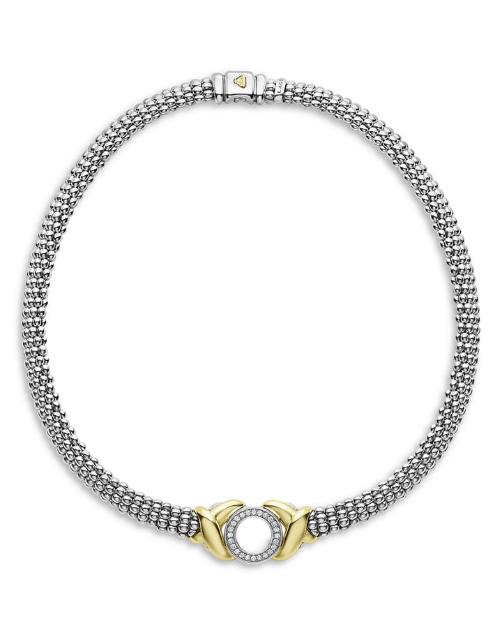 This 18K Yellow Gold & Sterling Silver Embrace Diamond XO Caviar Bead Collar Necklace, 18" by LAGOS from the Embrace collection combines elegance and symbolism. The diamond circle XO motif, accented with 18K yellow gold, sits on a sterling silver Caviar beaded rope, creating a luxurious and meaningful statement.