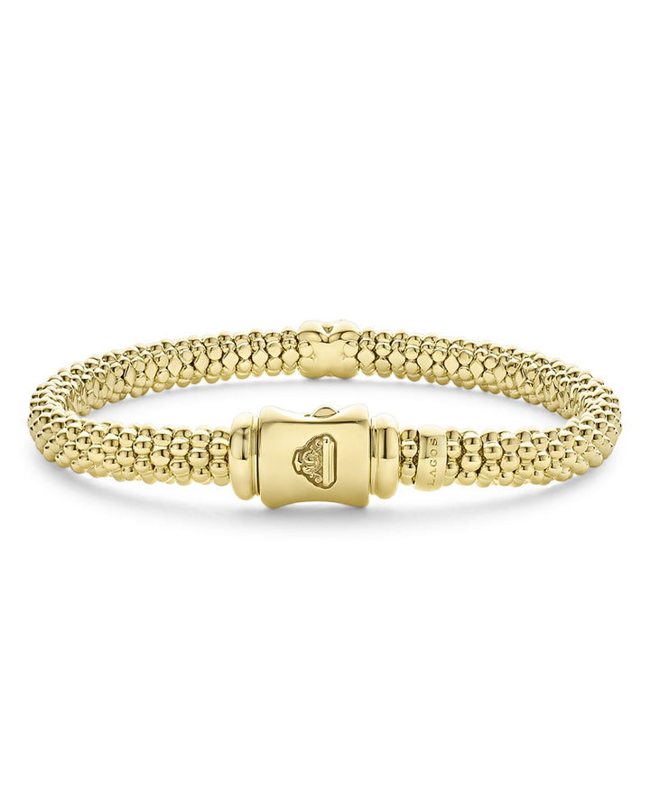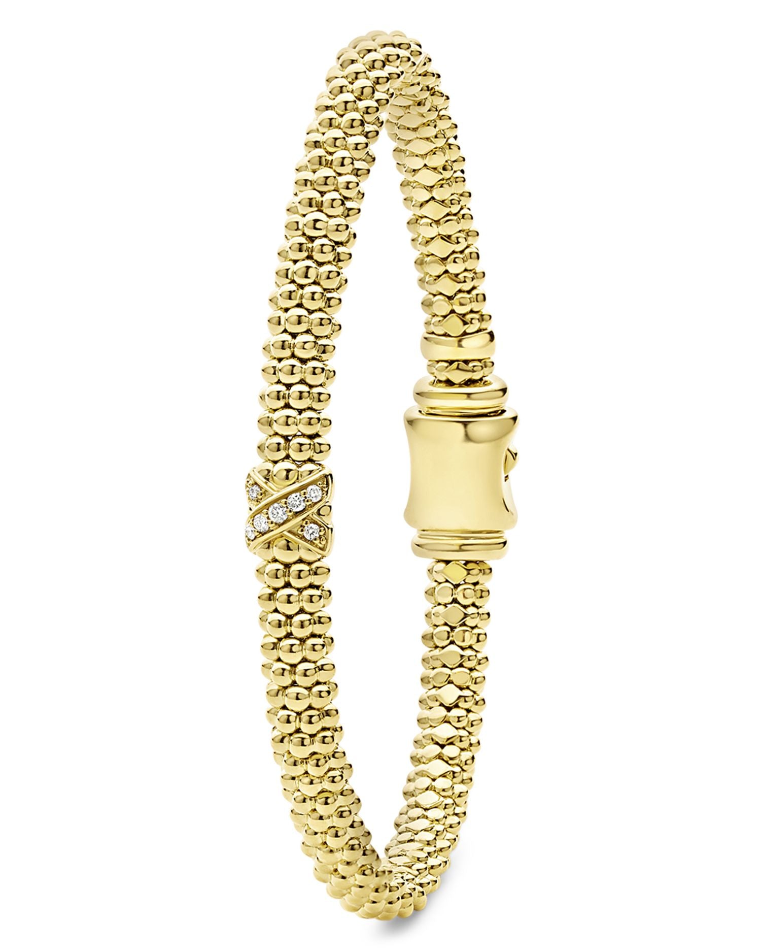 This 18K Yellow Gold Embrace Diamond X Caviar Bead Bracelet by LAGOS from the Embrace collection combines elegance and symbolism. The diamond 'X' motif graces the luxurious gold Caviar beaded design, creating a bracelet that is both timeless and meaningful.