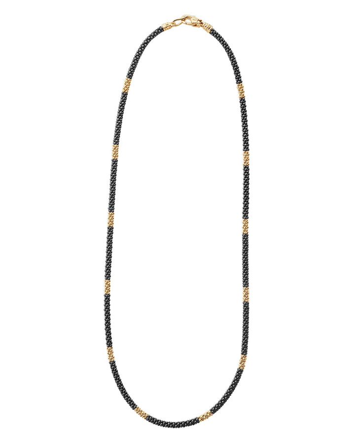 This Ceramic & 18K Yellow Gold Black Caviar Necklace, 18' by LAGOS from the Gold & Black Caviar collection is a bold and modern statement piece. Featuring twelve 18K gold stations interspersed with black ceramic Caviar beading, this necklace is finished with a signature gold clasp.