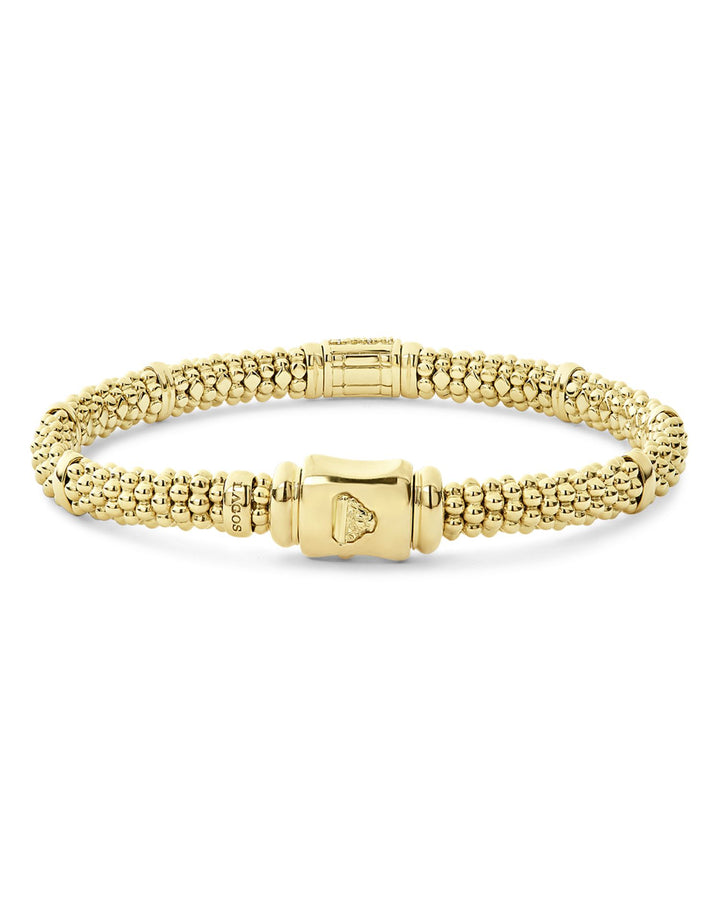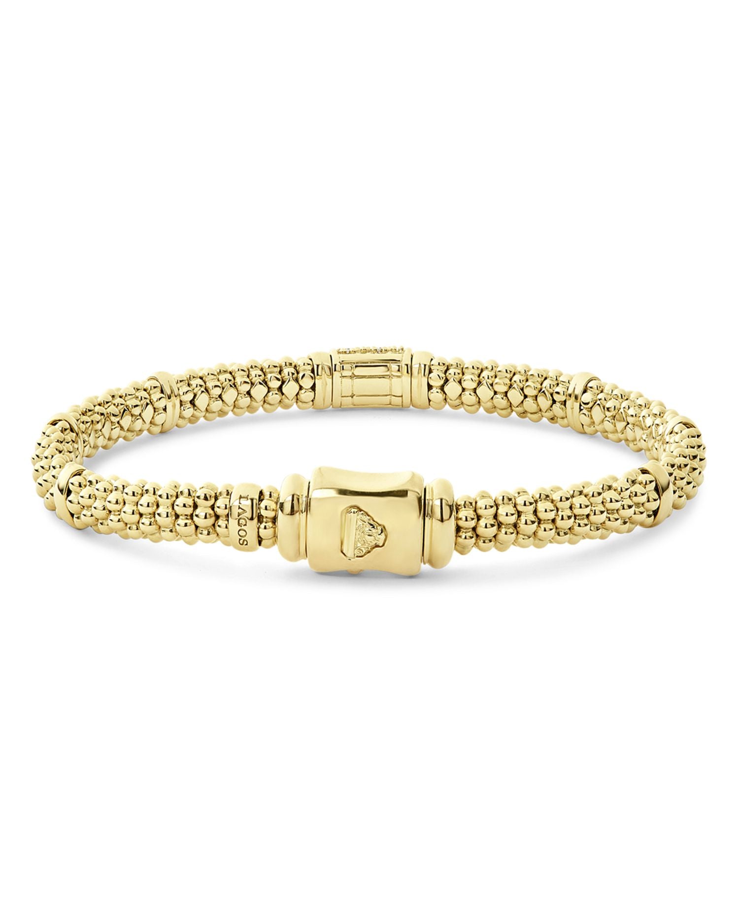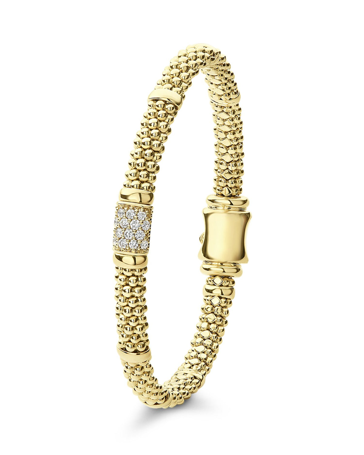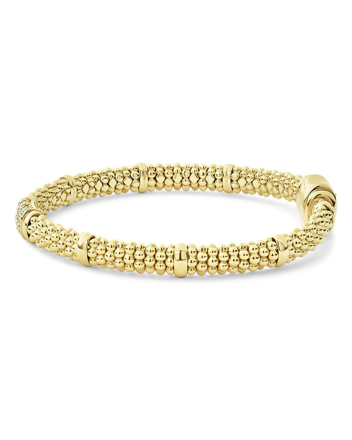 This 18K Yellow Gold Caviar Small Diamond Slim Station Bracelet by LAGOS is a refined piece from the Caviar Gold Collection, featuring intricate Caviar beading and sparkling diamonds. Its slim design and signature box clasp add timeless elegance.