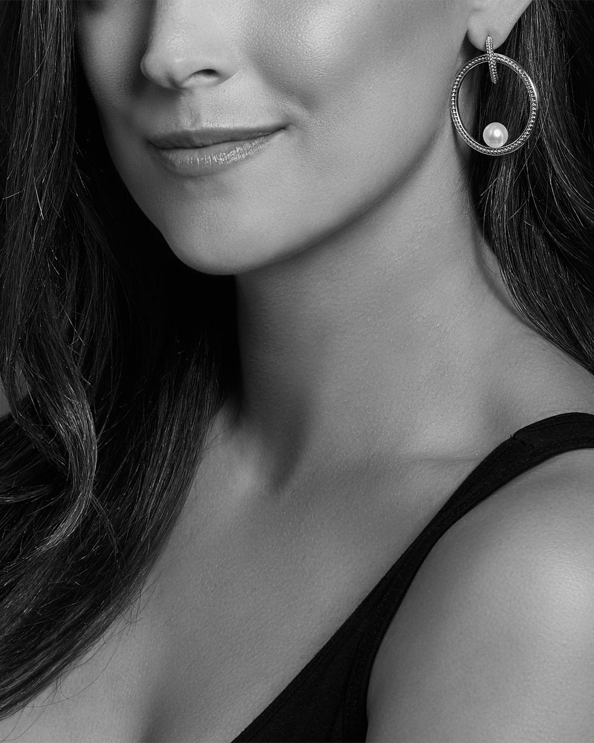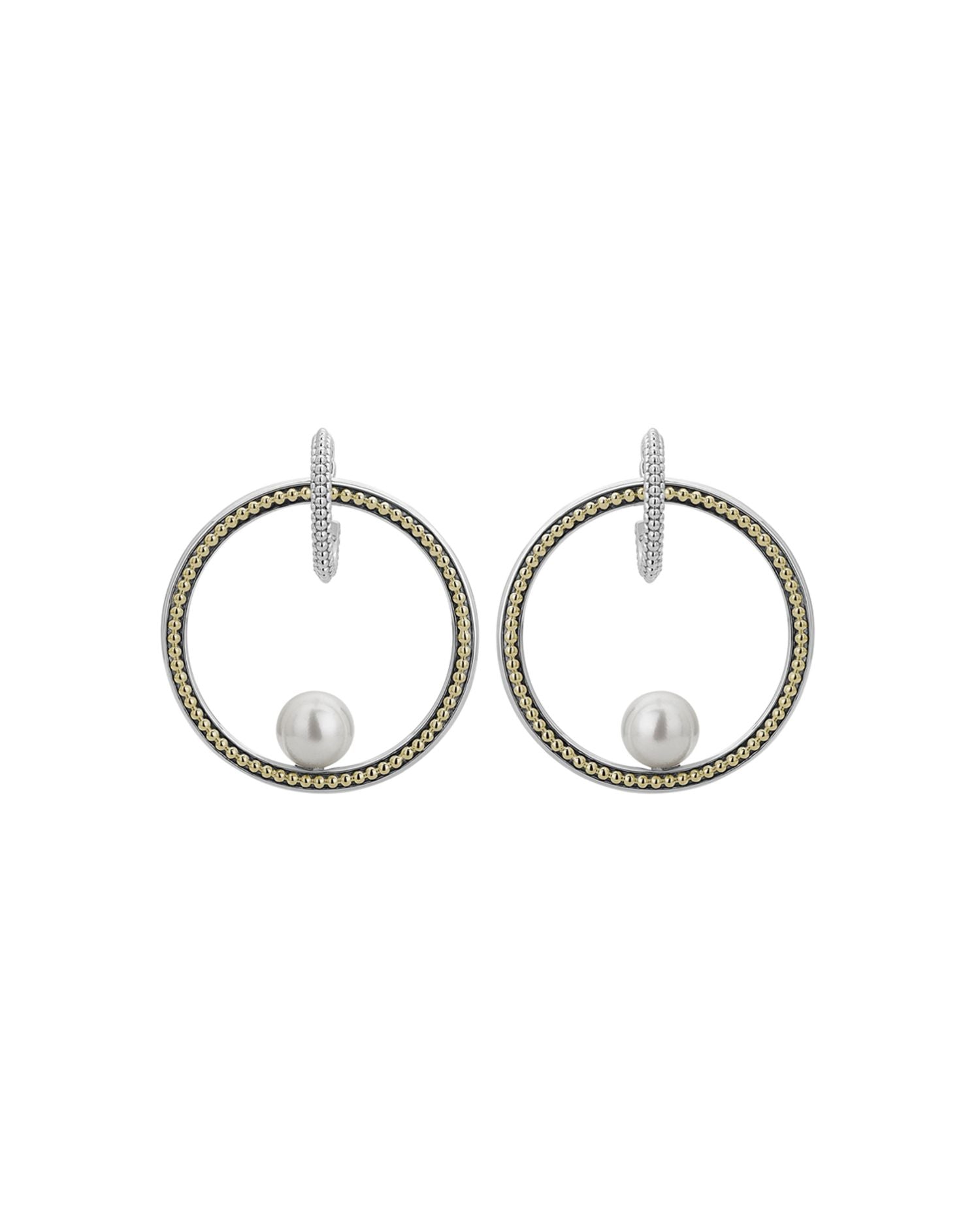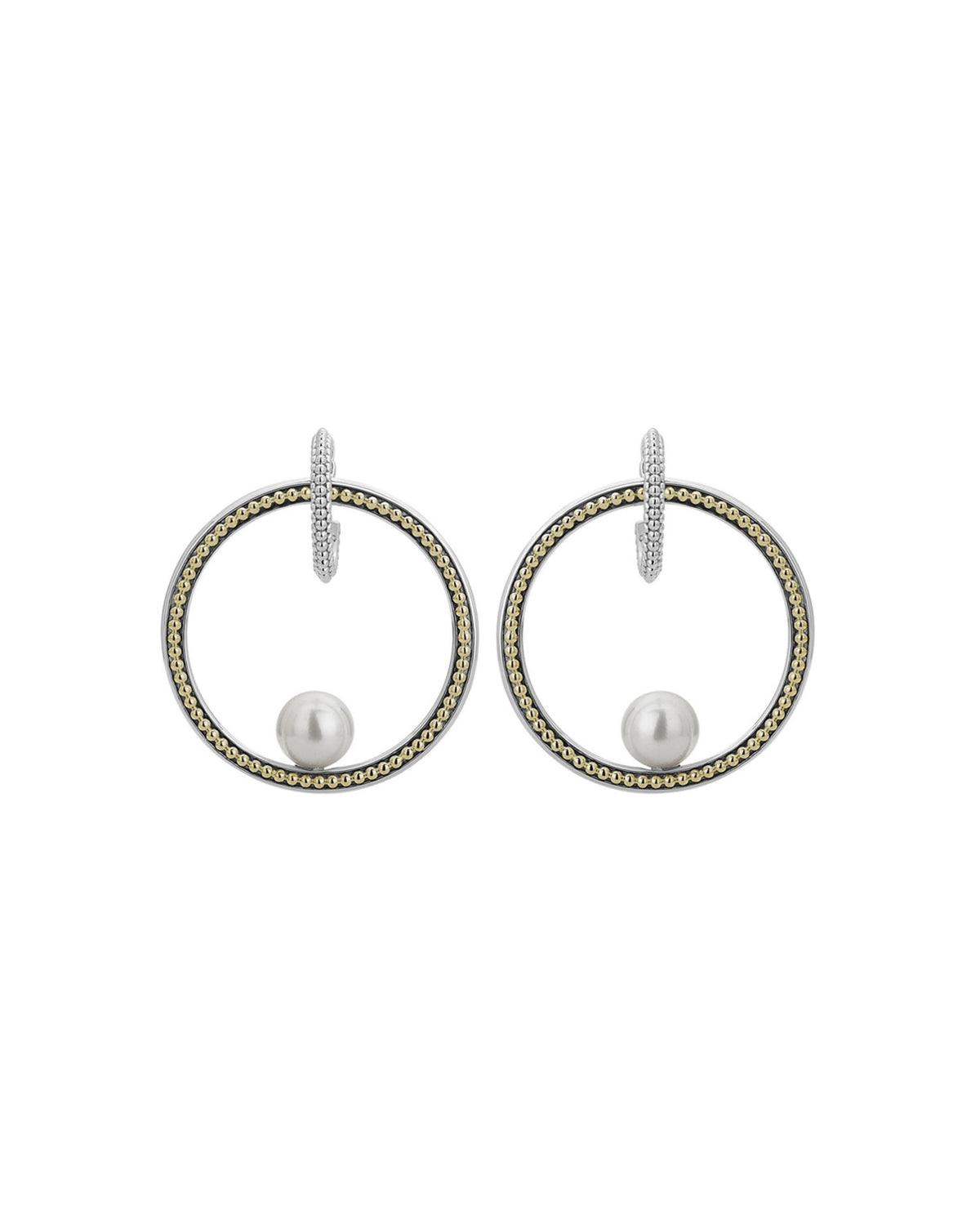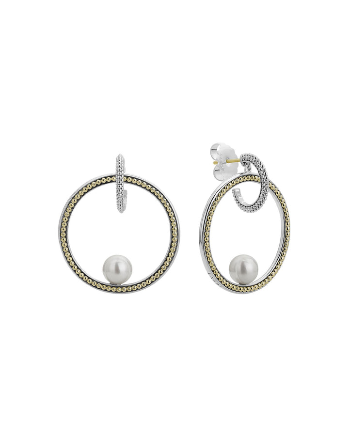 These Sterling Silver & 18K Yellow Gold Luna Cultured Freshwater Pearl Circle Earrings by LAGOS from the Luna collection blend two-tone Caviar beading with the lustrous elegance of cultured freshwater pearls. These earrings offer timeless sophistication and a unique design.
