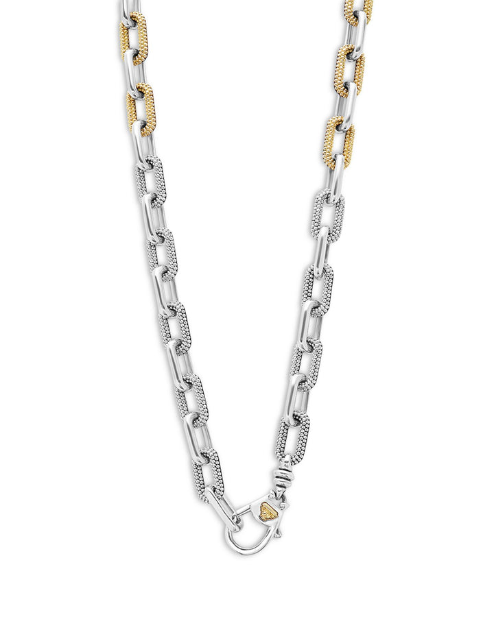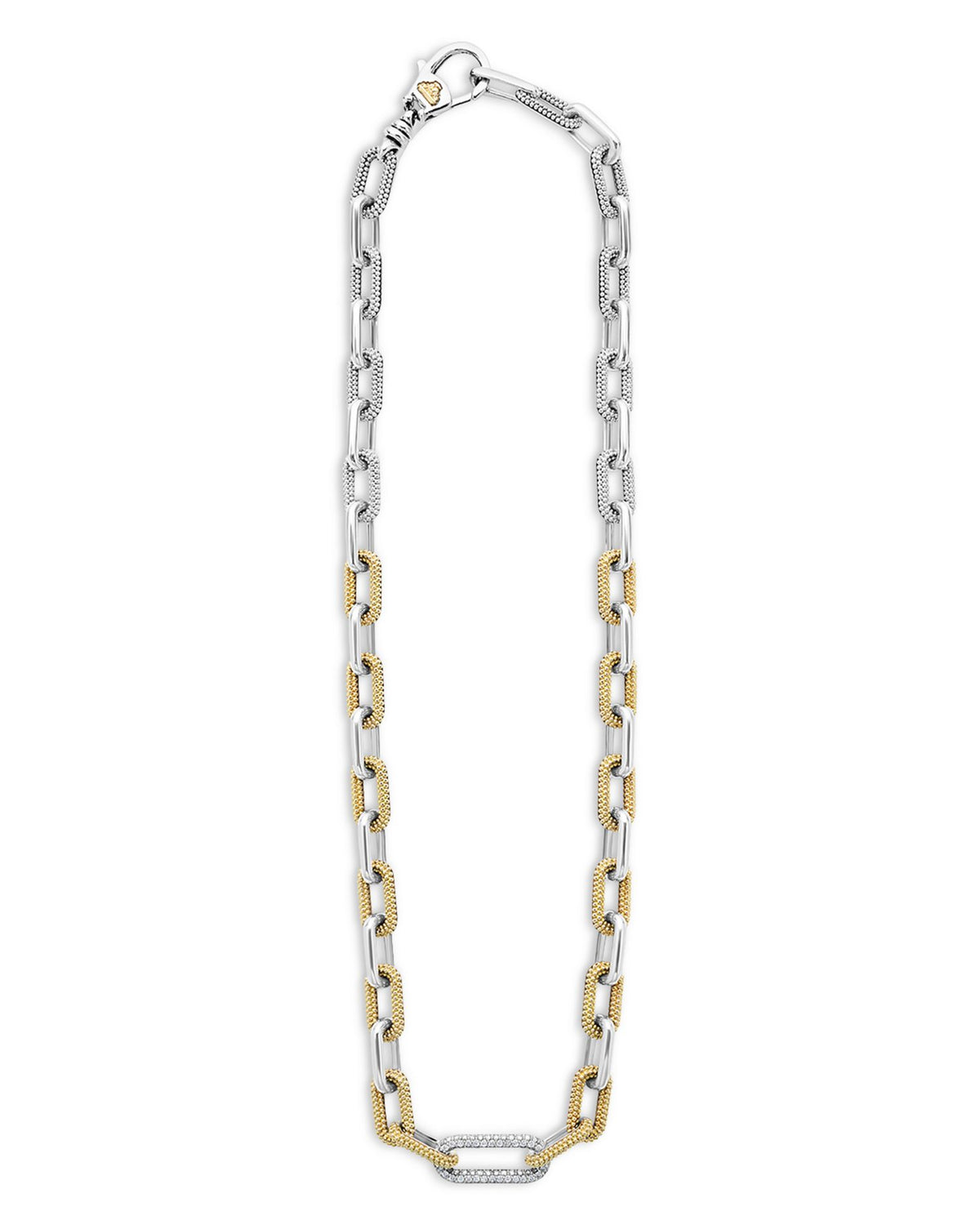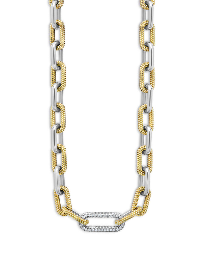 This 18K Yellow Gold & Silver Caviar Lux-Clip Diamond Link Necklace, 18' - Exclusive by LAGOS from the Caviar Lux-Clip collection is a striking piece of jewelry. With sparkling diamond links accented by 18K yellow gold and sterling silver, this necklace is an exclusive blend of elegance and modern design.