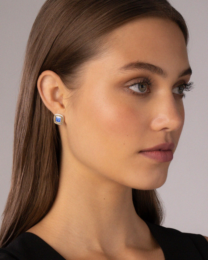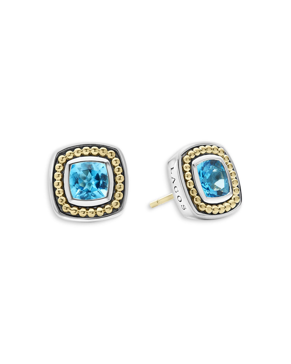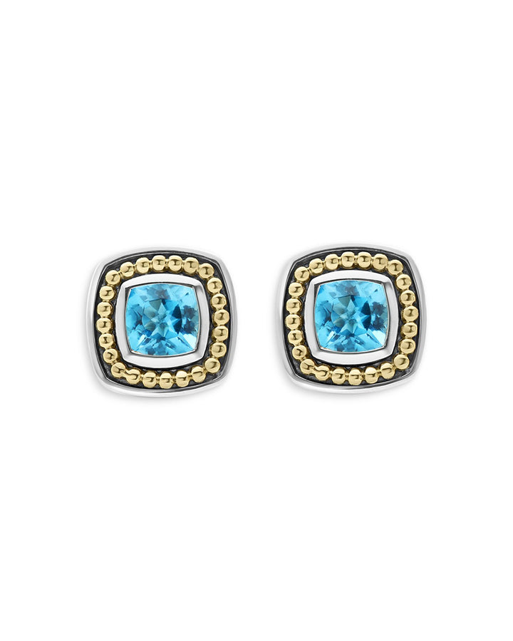 These 18K Yellow Gold & Sterling Silver Rittenhouse Blue Topaz Stud Earrings by LAGOS from the Rittenhouse collection are an elegant addition to your jewelry wardrobe. Featuring luminous Swiss blue topaz stones set in a two-tone design, these studs exude timeless beauty.