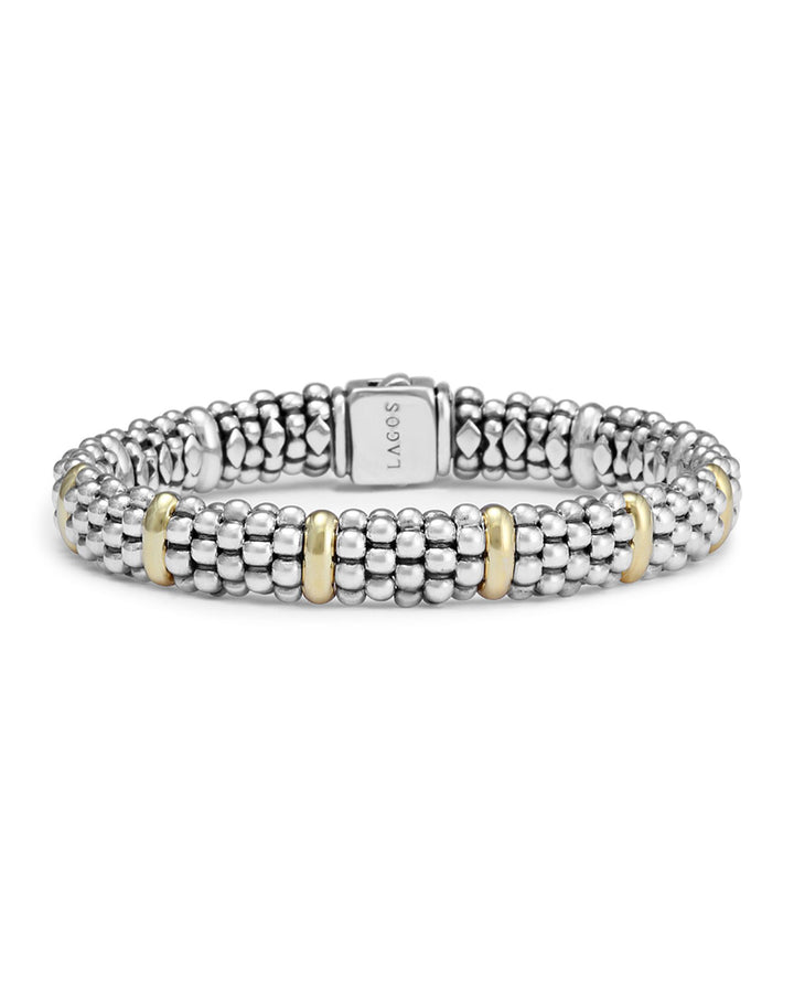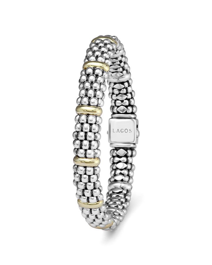 These Sterling Silver & 18K Yellow Gold Caviar Beaded Oval Bracelets by LAGOS are sophisticated accessories featuring luminous 18K yellow gold dividers that accentuate the rich sterling silver Caviar beading. Available in various sizes, these bracelets are perfect for stacking or wearing solo.