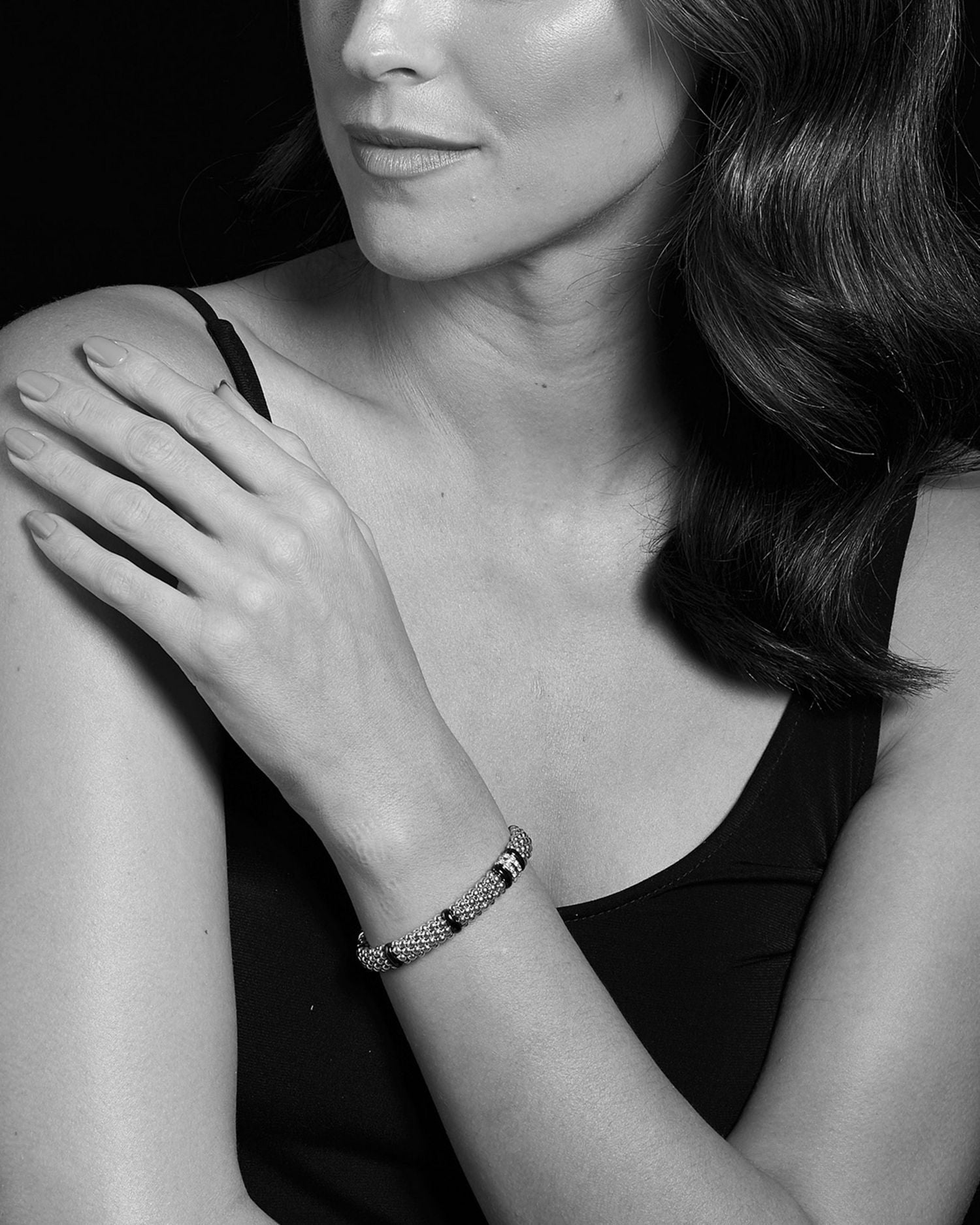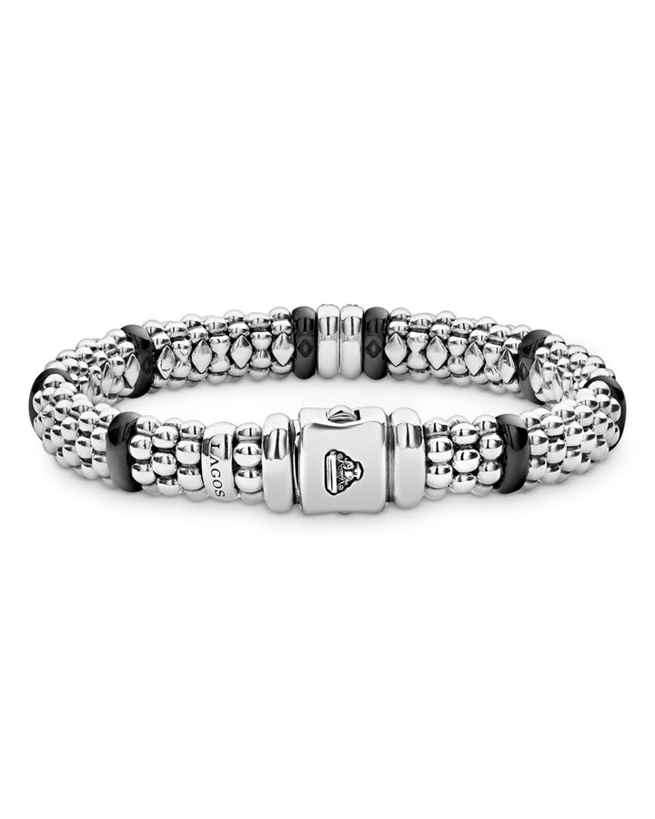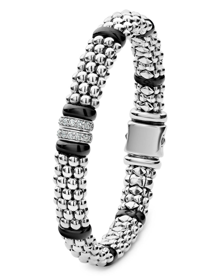 This Sterling Silver & Ceramic Caviar Beaded Diamond Station Bracelet by LAGOS is a chic and modern accessory. Featuring two pavé diamond stations framed by black ceramic Caviar beading, this bracelet is perfect for adding a subtle touch of sparkle to your everyday style.