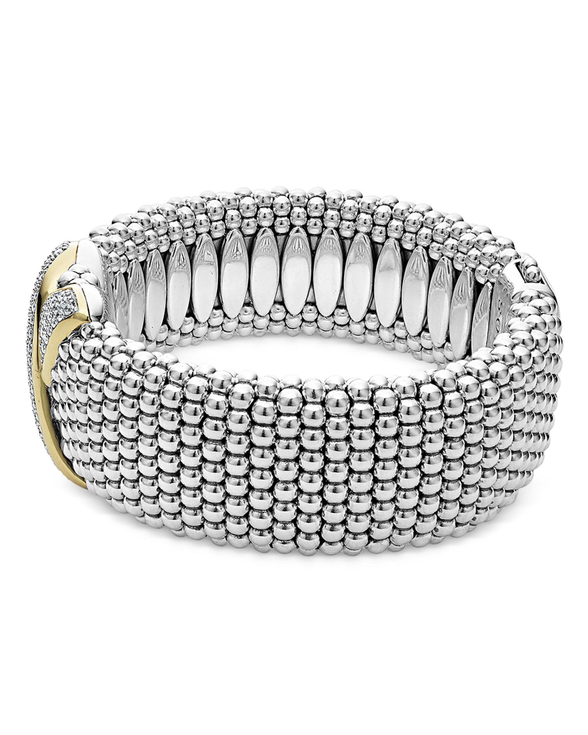 This 18K Yellow Gold & Sterling Silver Embrace Diamond Pavé Wide Link Bracelet by LAGOS is a luxurious piece from the Embrace Collection. Featuring an 18K gold 'X' with diamond pavé wrapping around sterling silver Caviar beading, it combines bold design with refined elegance.
