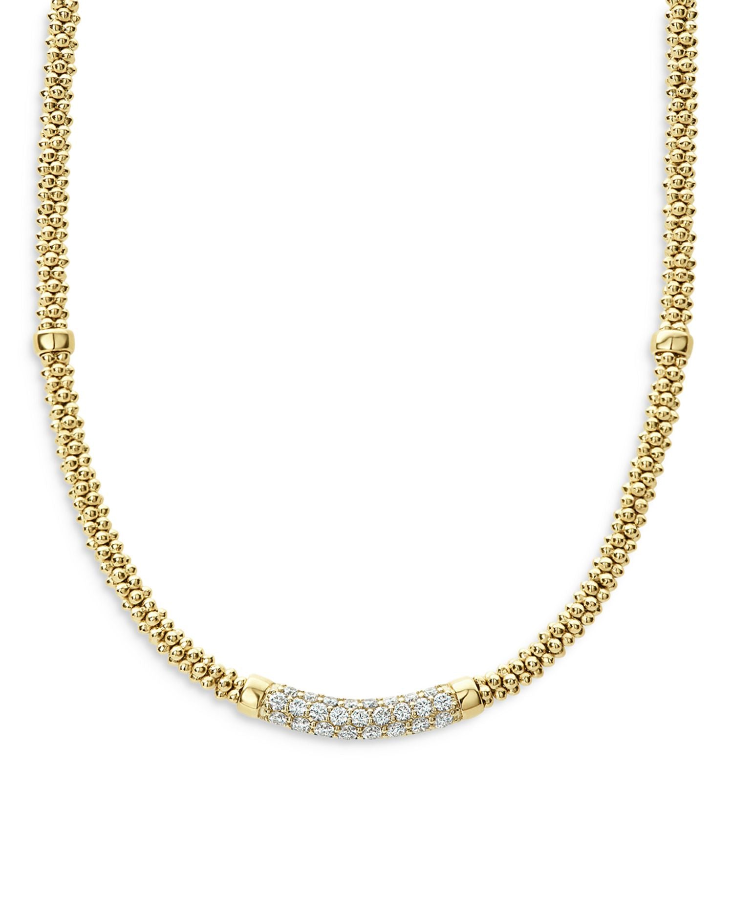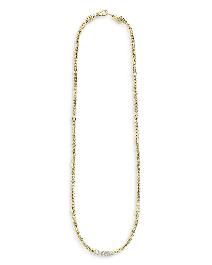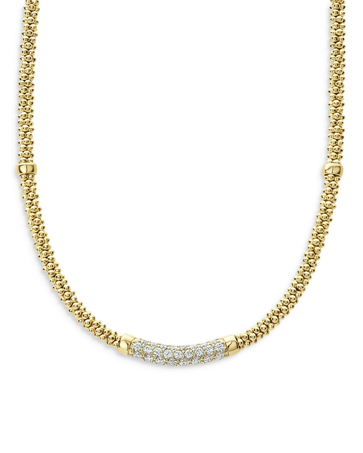 This 18K Yellow Gold Caviar Beaded Necklace with Diamonds, 16" by LAGOS is a signature piece of refined elegance. Featuring a sparkling diamond station framed by intricate gold Caviar beading, this necklace is a timeless and luxurious addition to any jewelry collection.