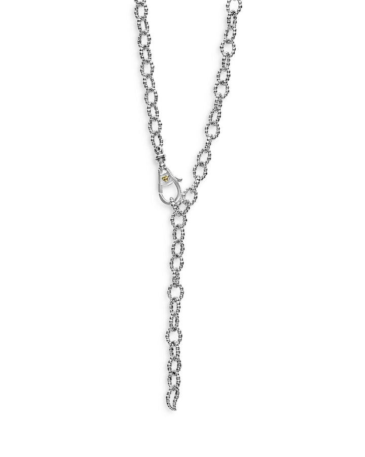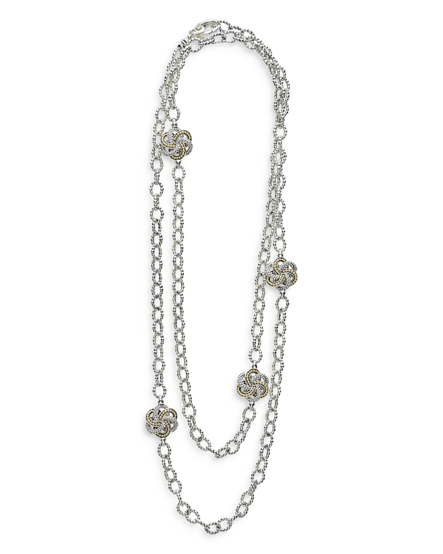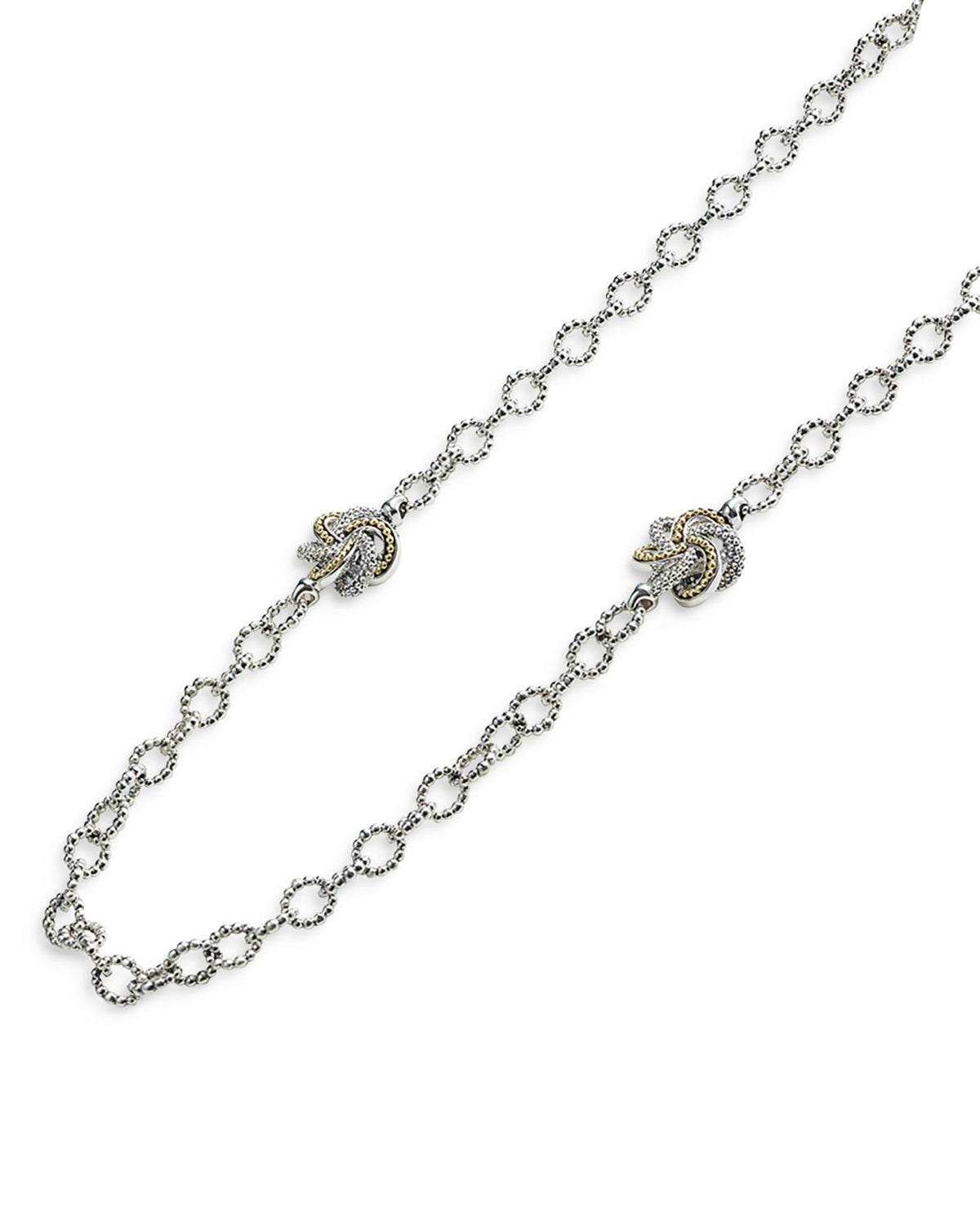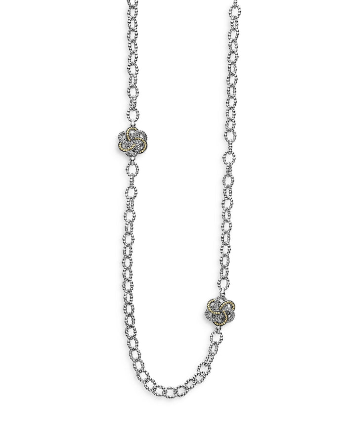 This Sterling Silver & 18K Yellow Gold Love Knot Station Necklace, 32' by LAGOS is a versatile and timeless accessory. Featuring sterling silver links accented by four mixed-metal Love Knot stations, this long necklace is perfect for layering or wearing solo for a classic yet modern look.