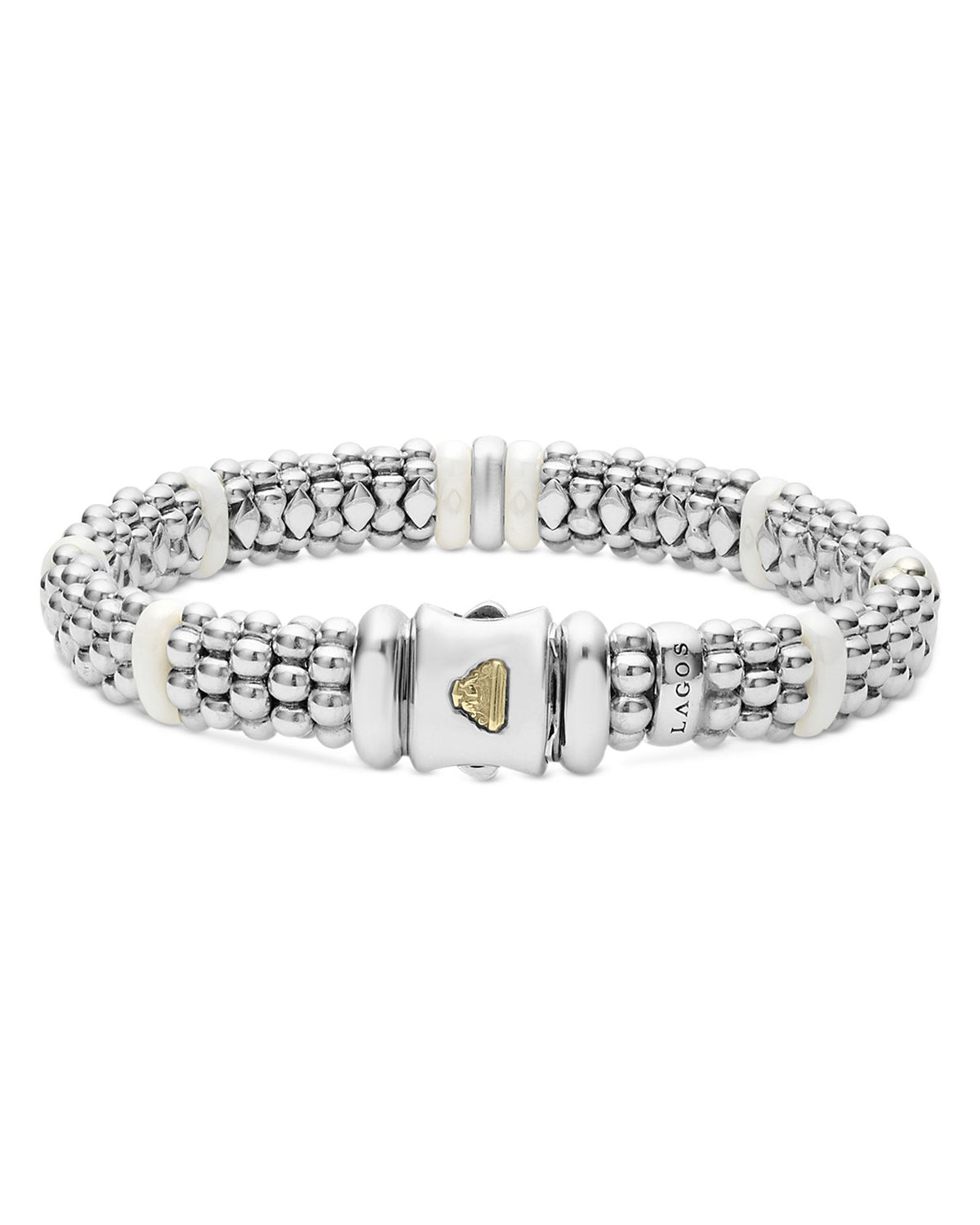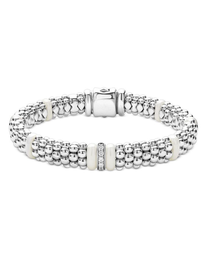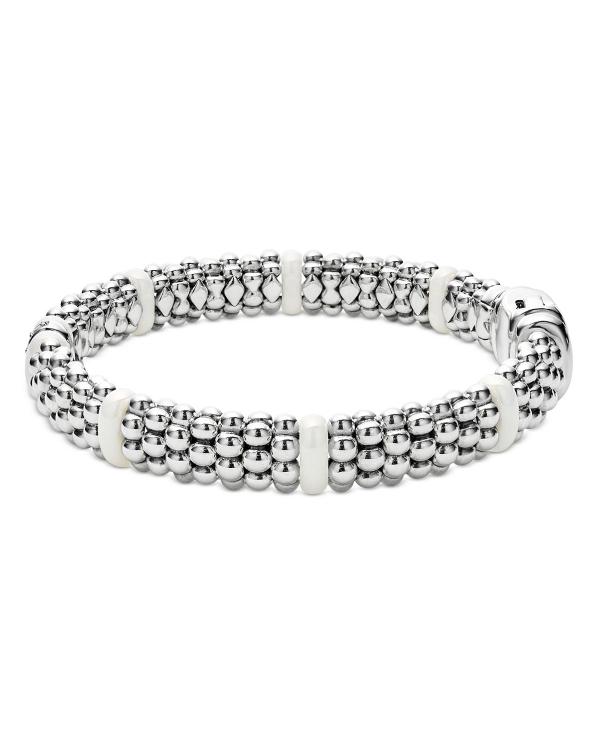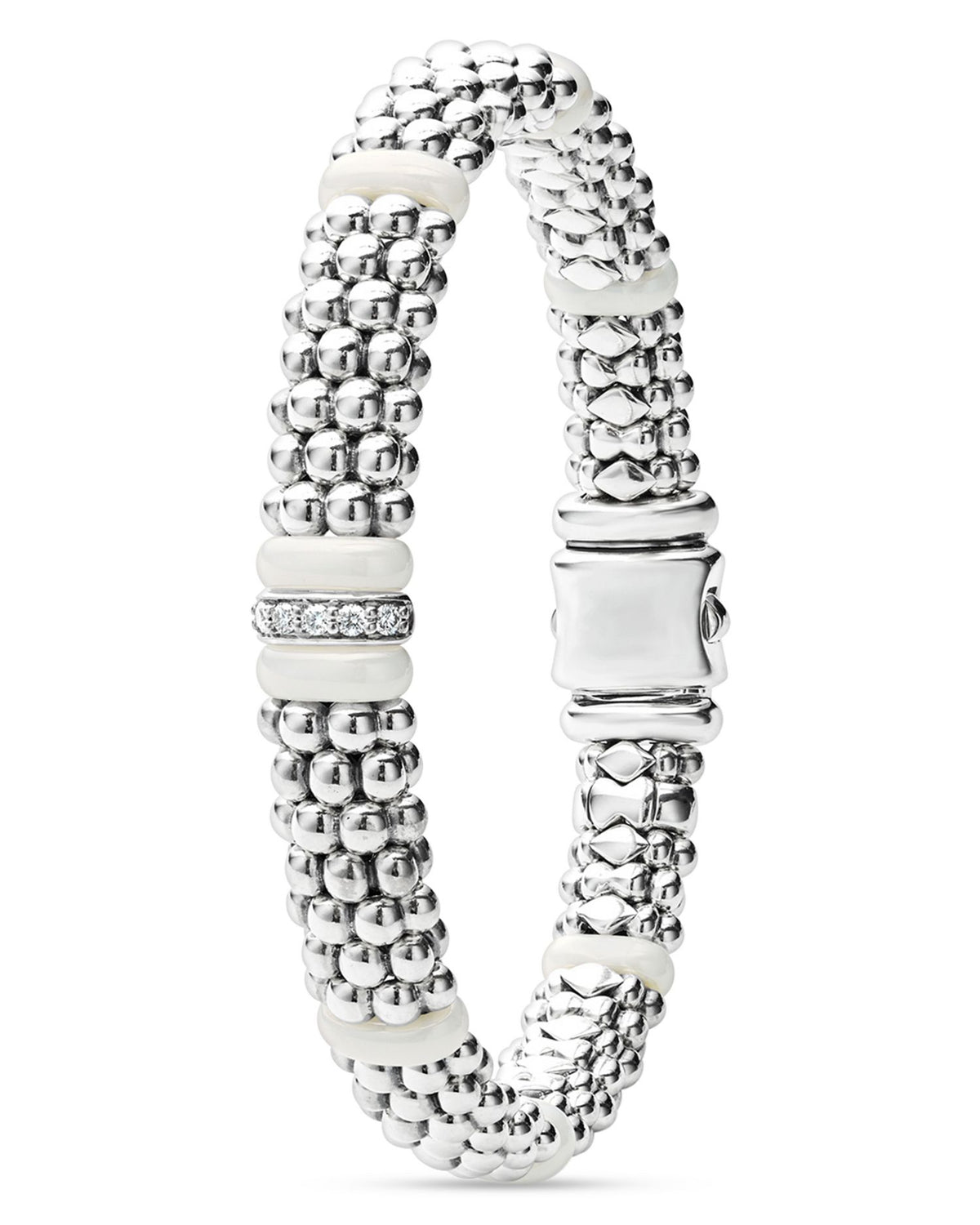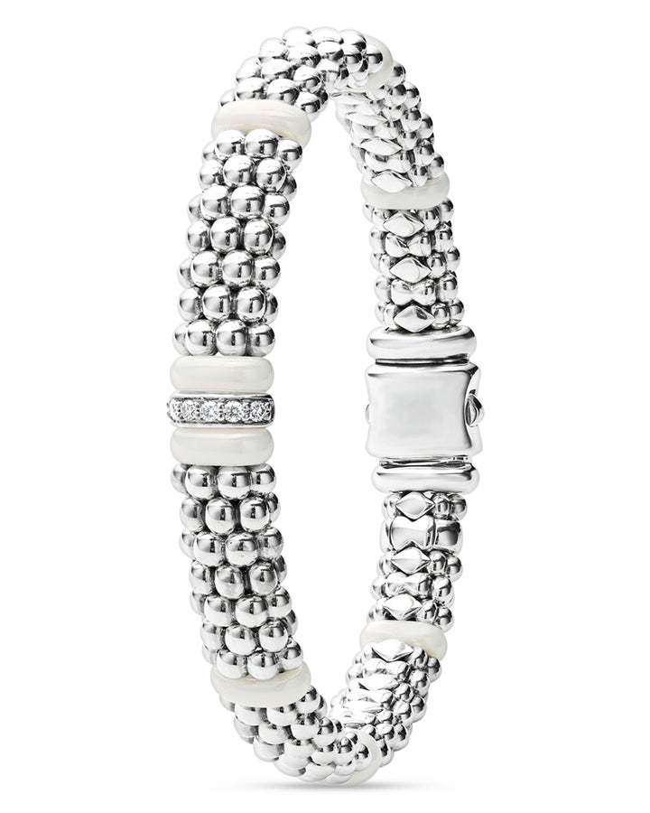 These Sterling Silver White Caviar Ceramic & Diamond Beaded Bracelets by LAGOS from the White Caviar collection combine sleek ceramic details with rows of sparkling pavé diamonds. A luxurious design that adds understated elegance to any outfit.