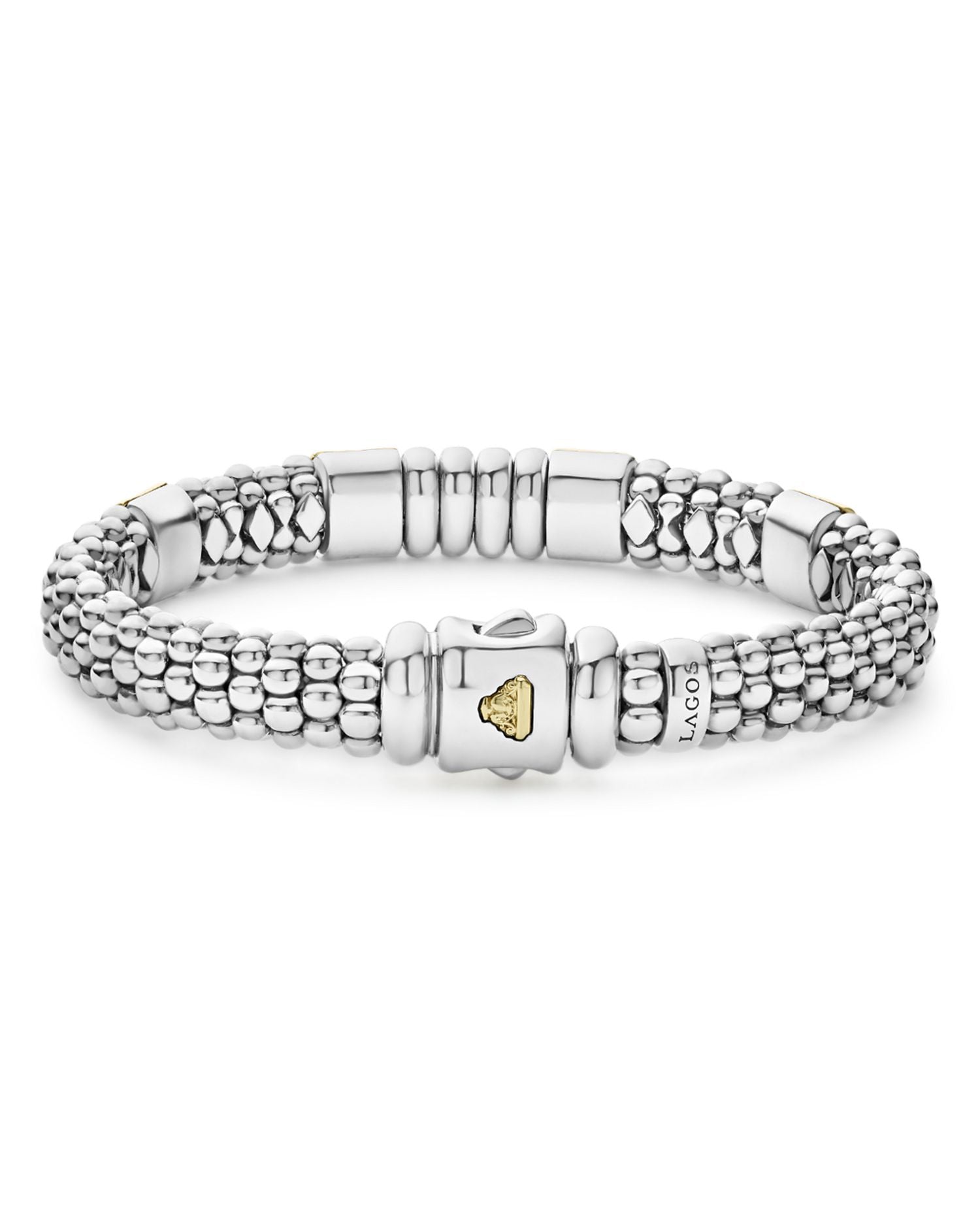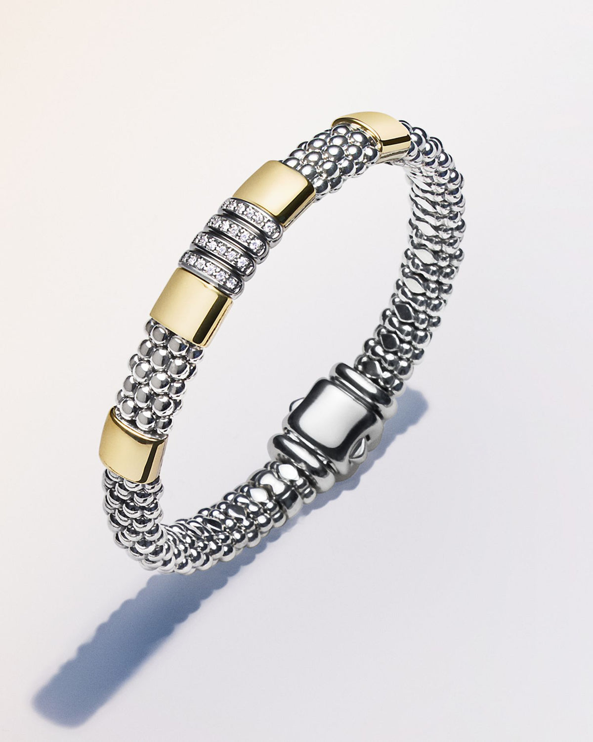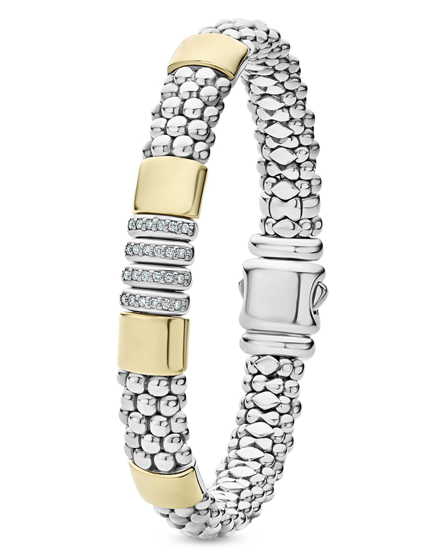 This 18K Gold and Sterling Silver Diamond Caviar Lux Bracelet by LAGOS from the Caviar Lux Collection showcases a timeless design, featuring diamond-studded Caviar beading and luxurious 18K gold stations.