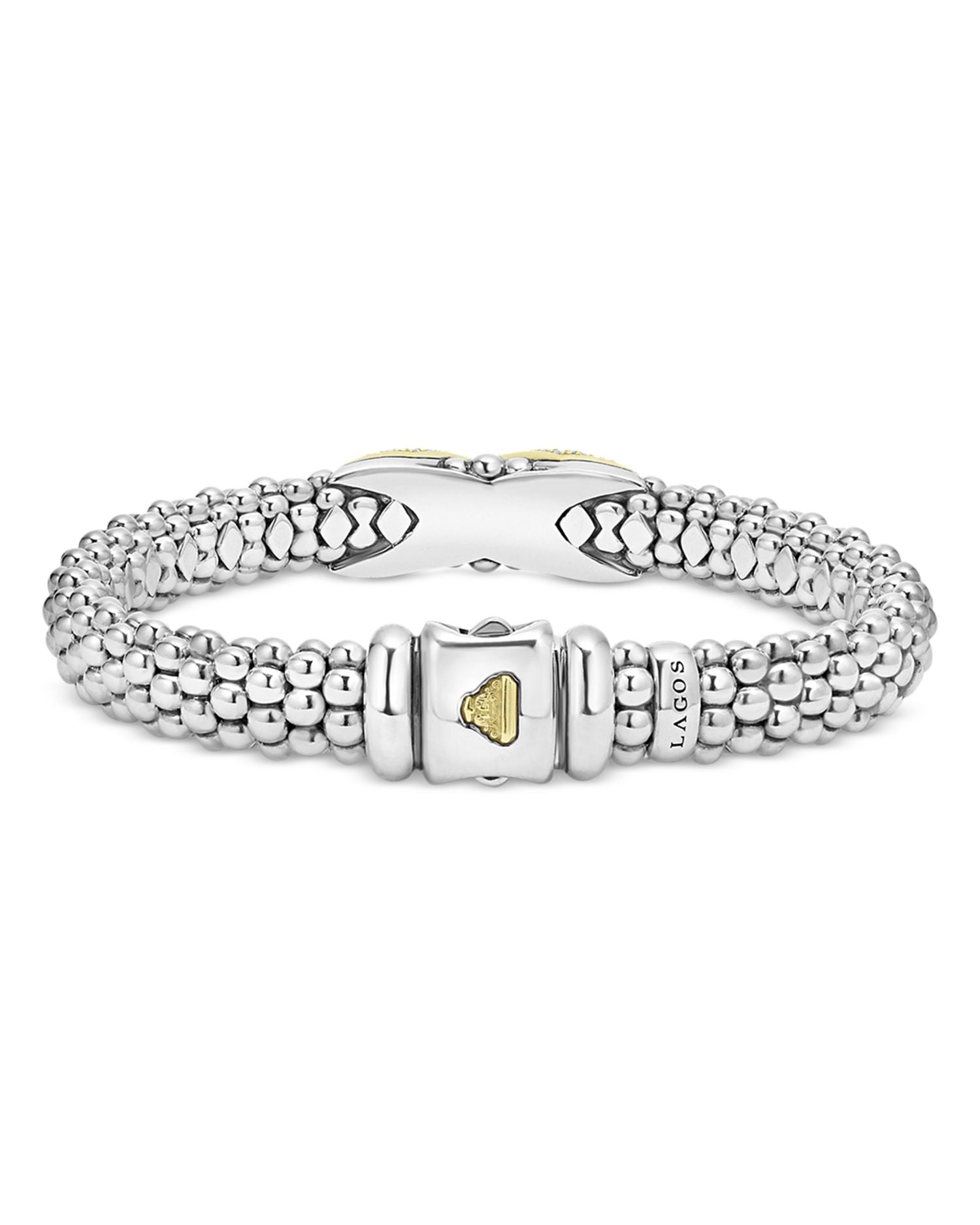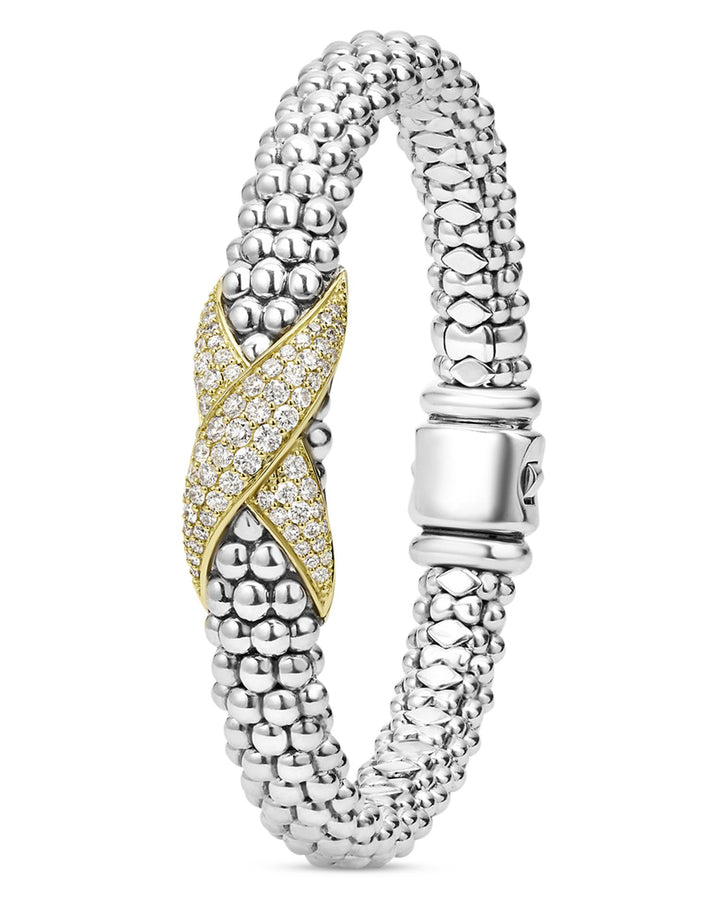 This 18K Yellow Gold & Sterling Silver Embrace Diamond Pavé X Caviar Bead Bracelet by LAGOS from the Embrace collection is a bold and refined statement. Featuring a diamond pavé 'X' motif in 18K gold embracing sterling silver Caviar beads, this bracelet is a luxurious addition to any collection.