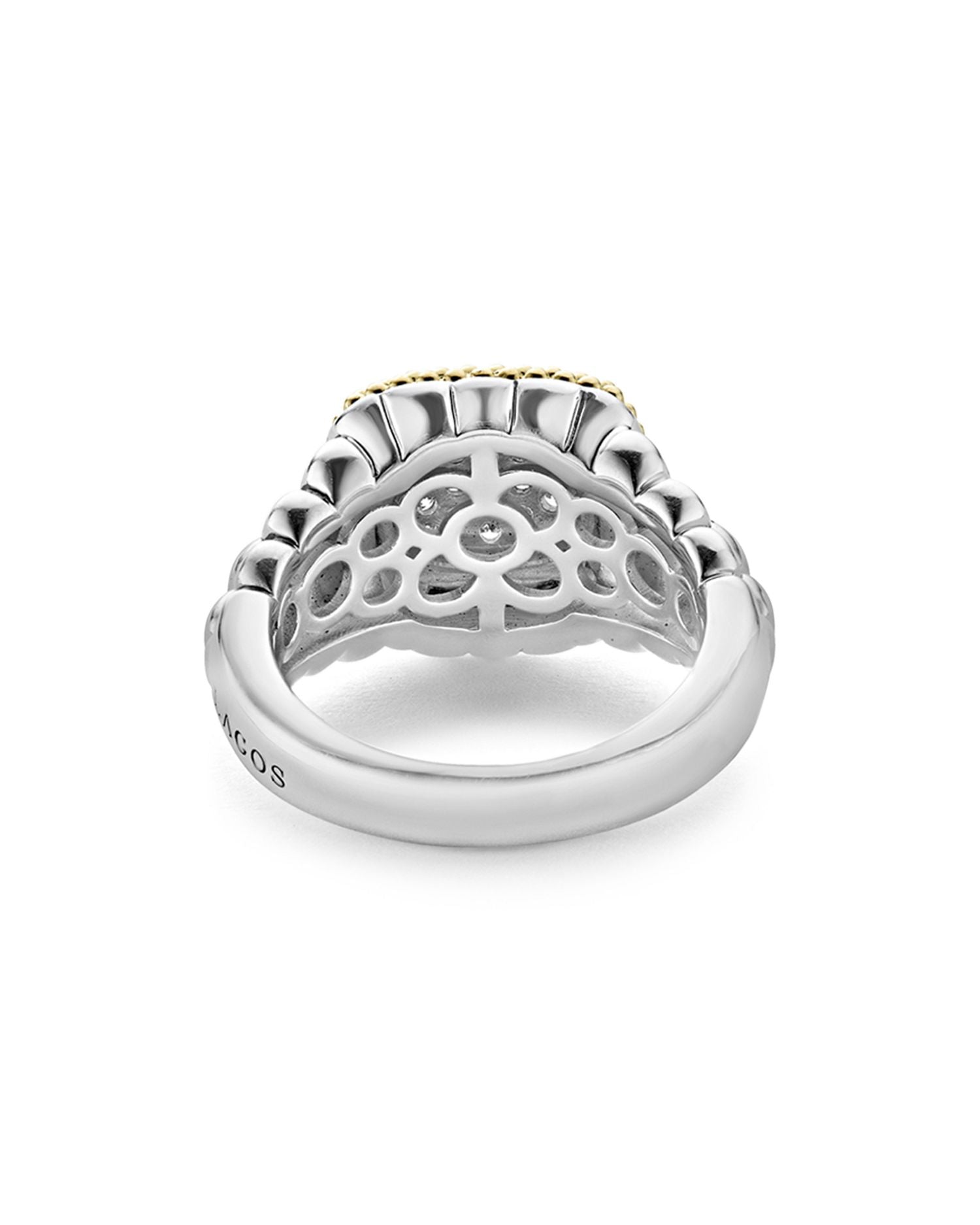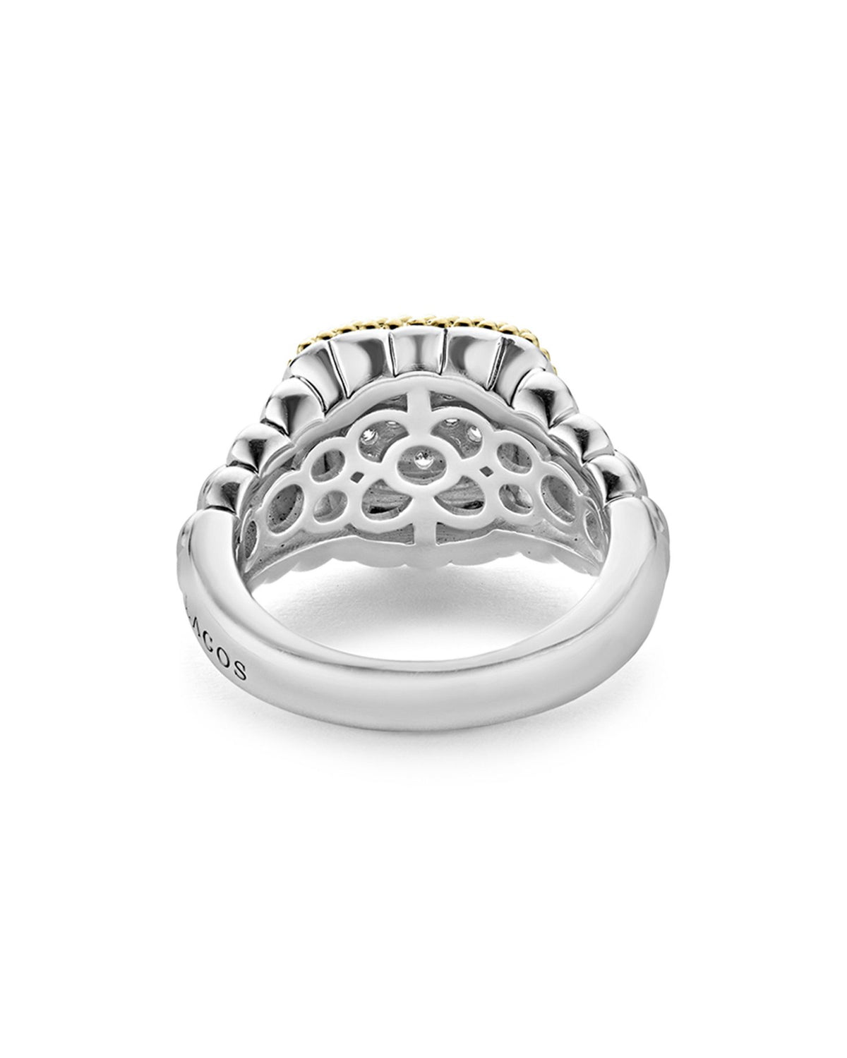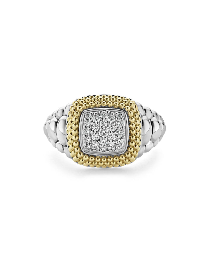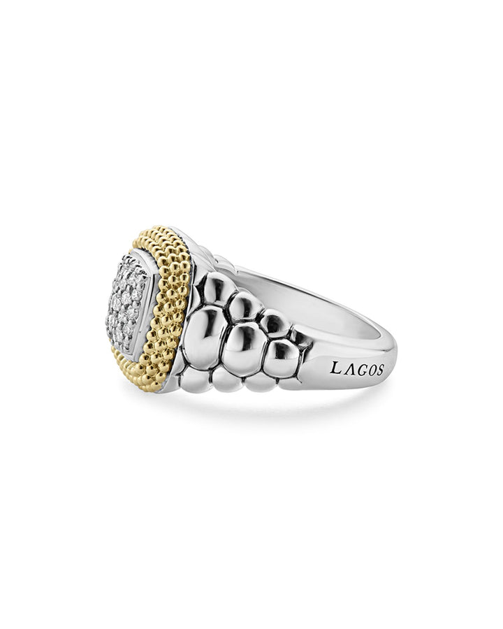 This 18K Gold and Sterling Silver Diamond Lux Square Ring by LAGOS combines the luxury of 18K gold and sterling silver with sparkling diamonds. Its sleek square design makes it a modern and elegant choice for any occasion.