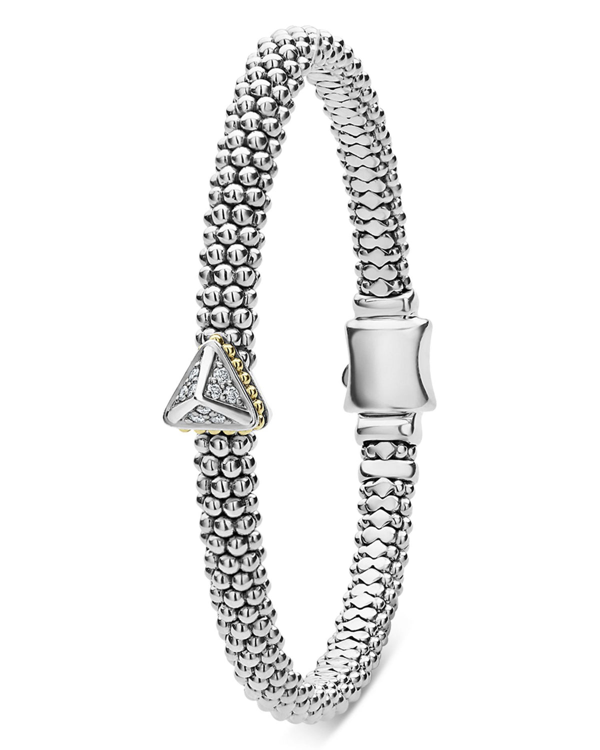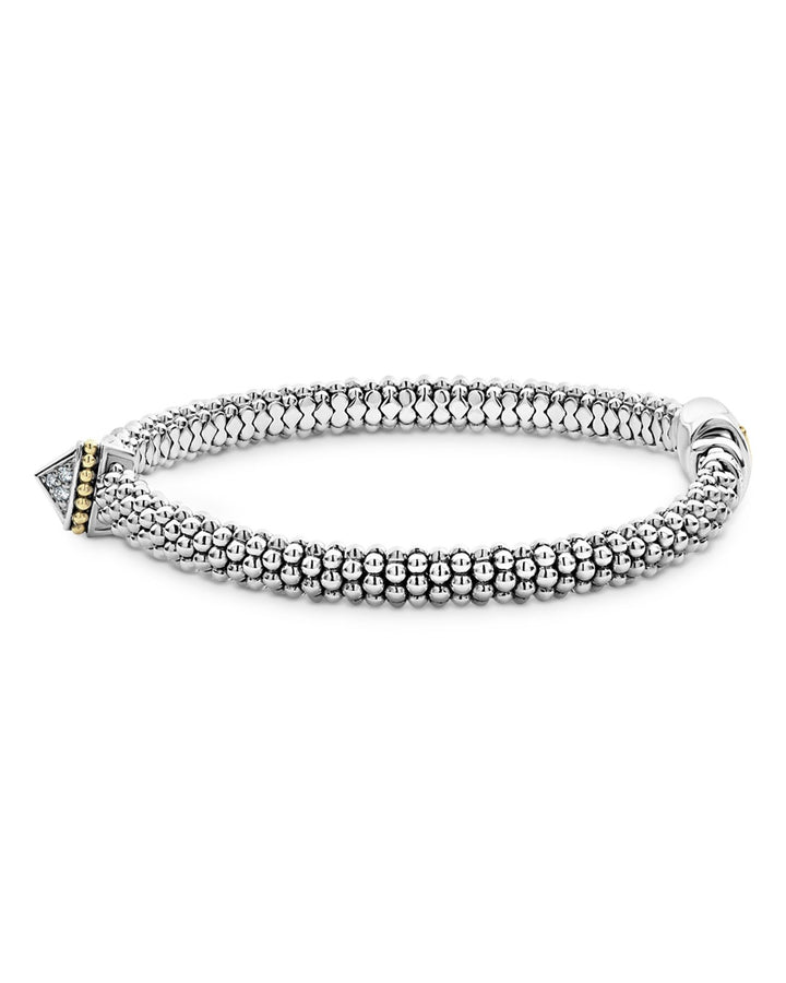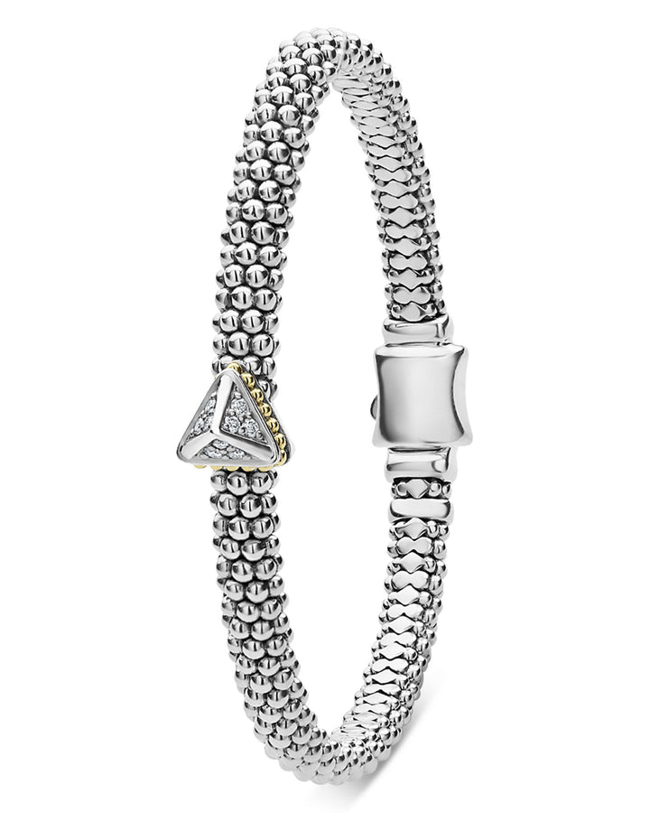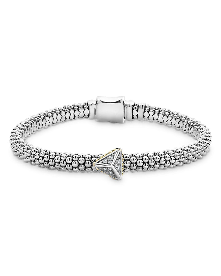 This KSL 18K Yellow Gold, Sterling Silver and Diamond Pyramid Caviar Beaded Bracelet by LAGOS from the KSL collection is a stunning and versatile piece. Featuring a diamond-paved pyramid with gold accents, this bracelet combines the elegance of sterling silver Caviar beading with a bold geometric design.