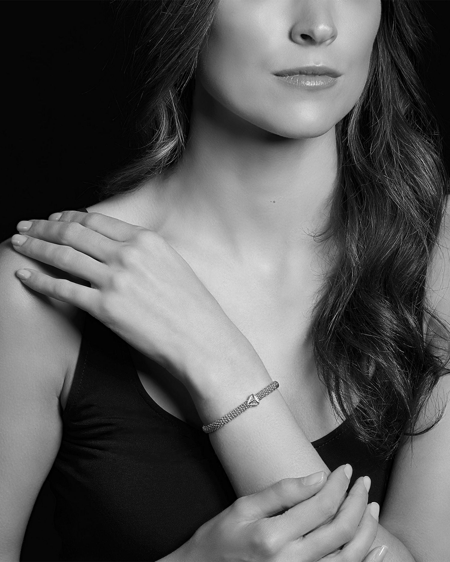 Made from sterling silver and 18K yellow gold with diamonds totaling 0.13 ct. t.w. Features a signature box clasp and measures 0.23' wide; medium fits wrist sizes 6.25'-6.75' in circumference. Some silver jewelry may be surface-coated with rhodium to enhance color and shine, which may wear off over time requiring replating.